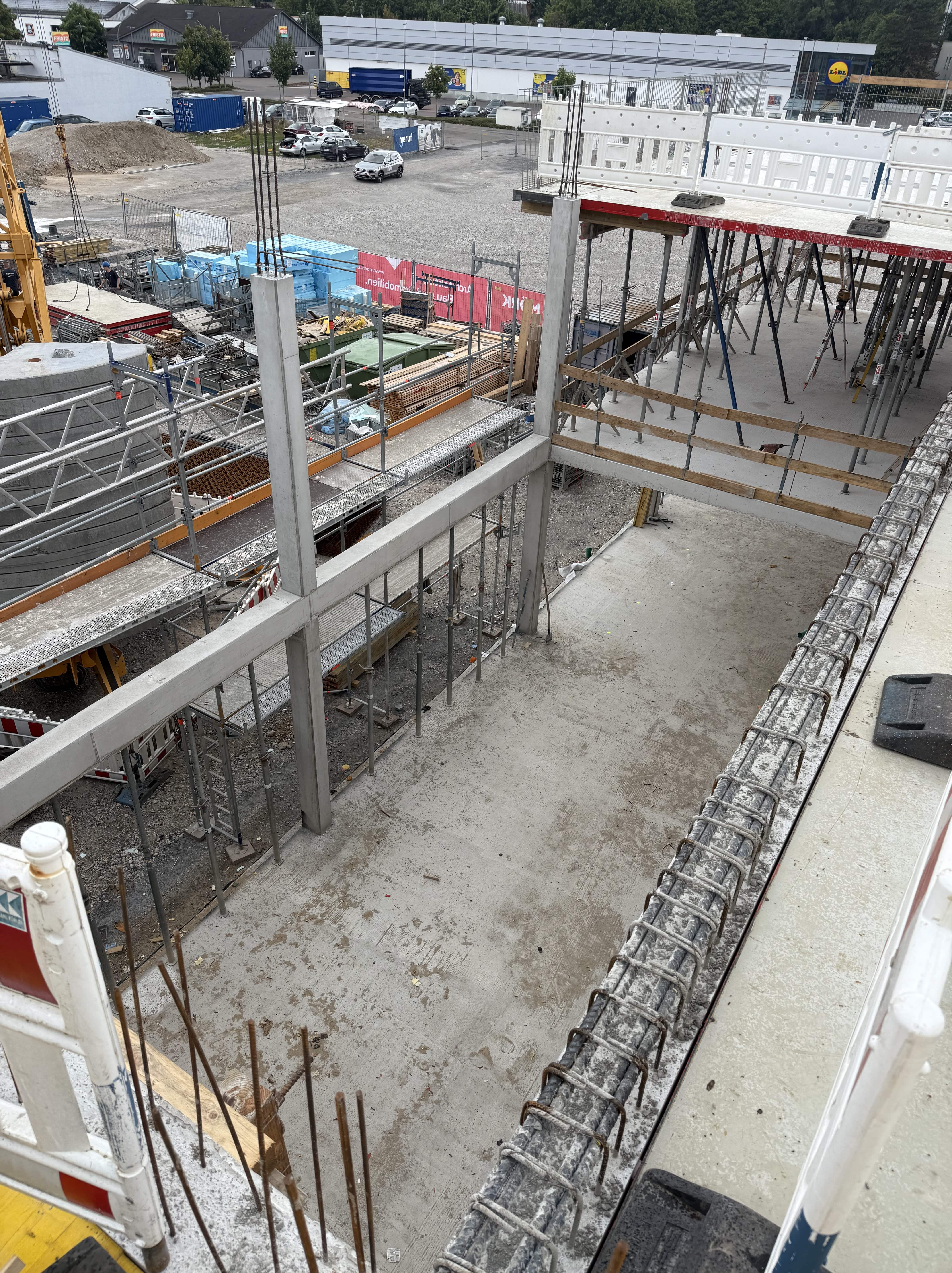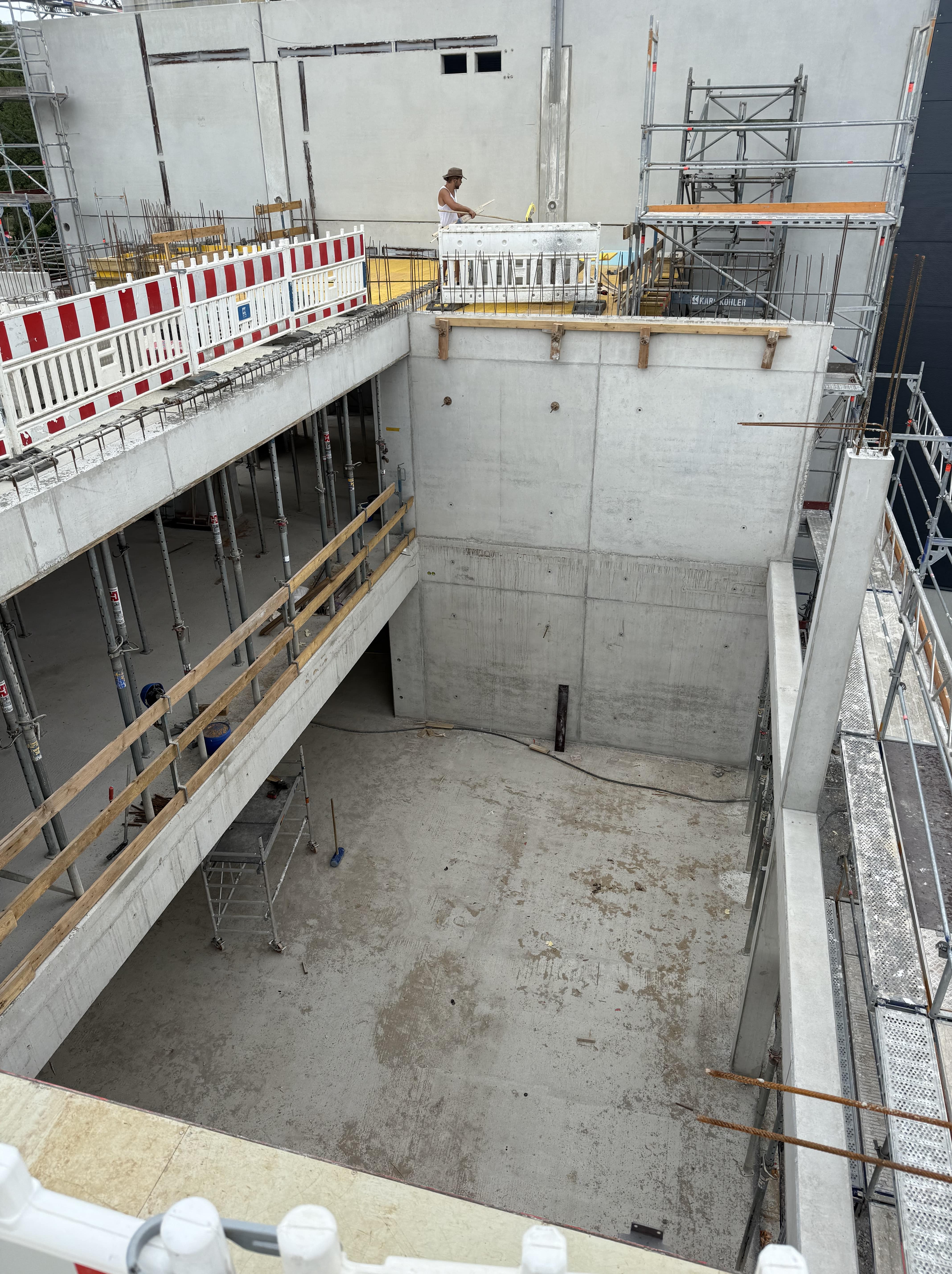 En avril, les travaux avancent à grands pas : les premiers piliers sont en place et le bâtiment prend visiblement de la hauteur. Un véritable point fort : l'un des piliers pèse 16,8 tonnes, un poids impressionnant qui symbolise la stabilité de notre futur bâtiment. Des progrès ont également été réalisés en matière de sécurité : Le mur coupe-feu est en place et garantit que les principales réglementations en matière de construction sont respectées dès le départ. Les progrès sont évidents : ce qui était encore en préparation en profondeur en mars se dresse désormais avec force à la verticale. Nous attendons avec impatience les prochaines étapes. Restez à l'écoute, les choses vont s'enchaîner à un rythme effréné !