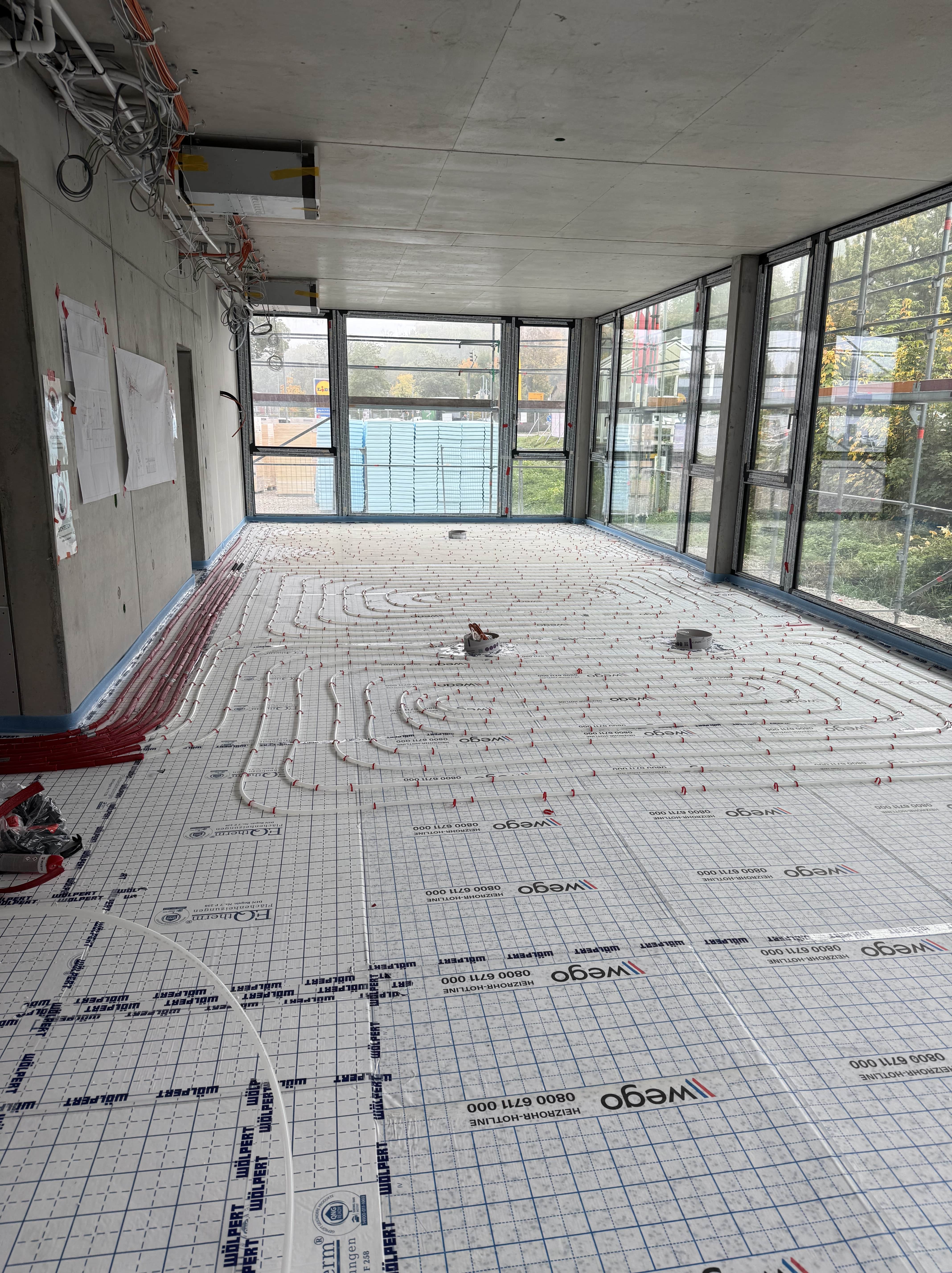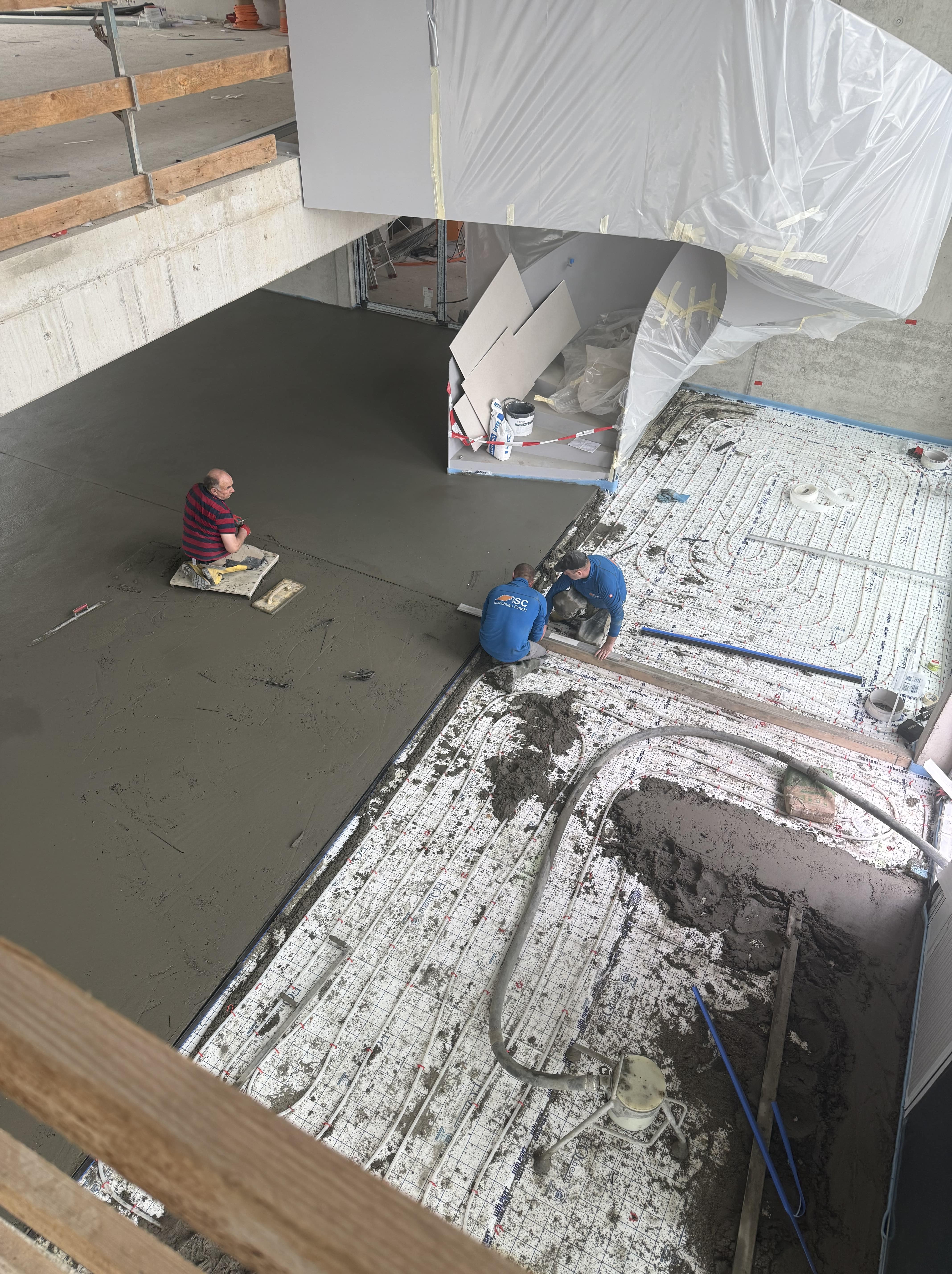 De plus, les tuyaux du chauffage au sol ont été posés et la première chape coulée. Peu à peu, l’intérieur du bâtiment prend forme, bientôt prêt à offrir chaleur et confort modernes.