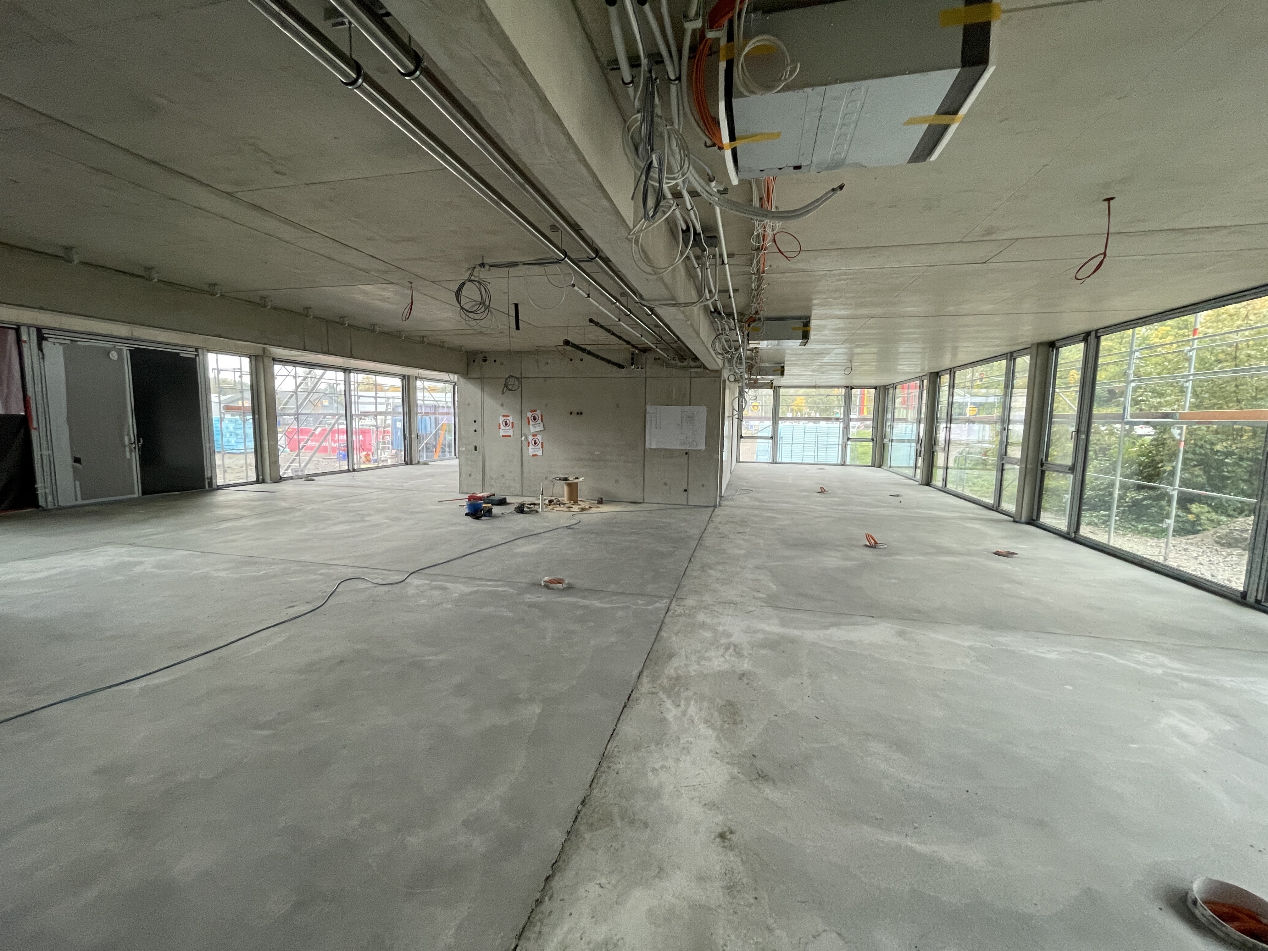 En octobre, les travaux ont bien avancé dans le bâtiment de bureaux : la pré-installation électrique et sanitaire du rez-de-chaussée est terminée. Les câbles, raccordements et installations de base sont prêts – une étape importante pour la suite de l’aménagement intérieur.
