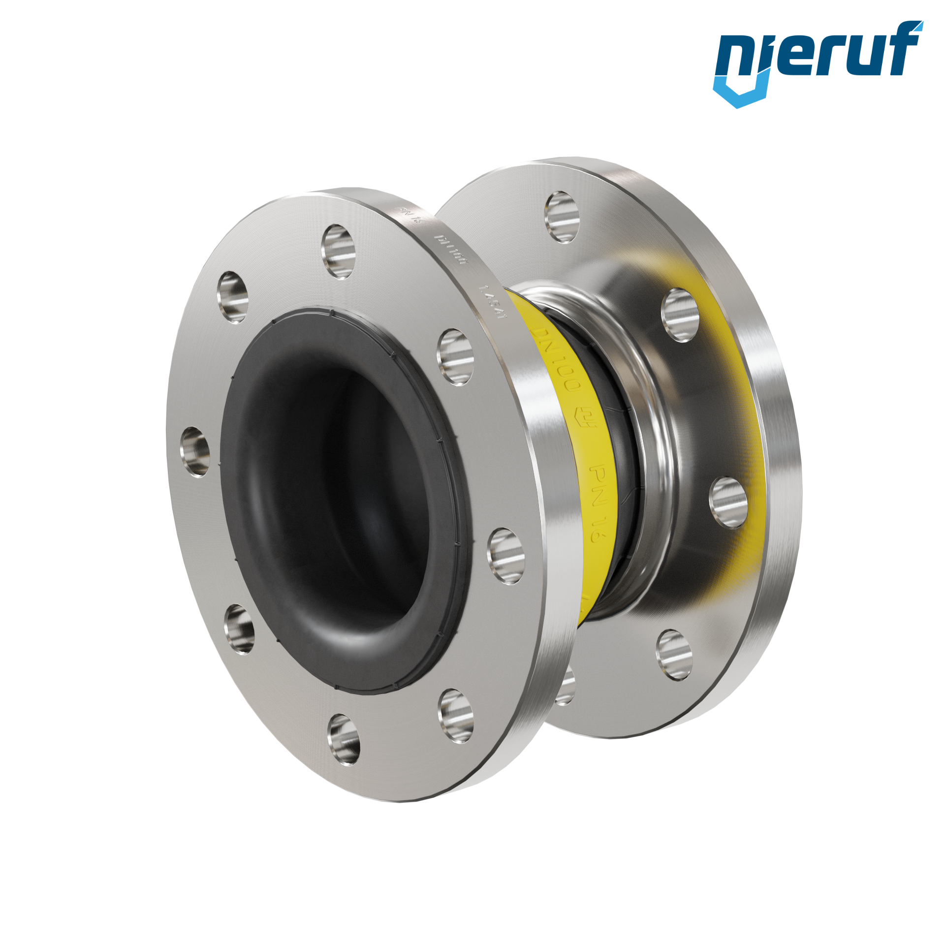 Compensateur en caoutchouc de haute qualité avec joint NBR et brides en acier inoxydable. Le modèle peut être étendu avec un revêtement en PTFE, des anneaux de support de vide et d'autres options sur demande.