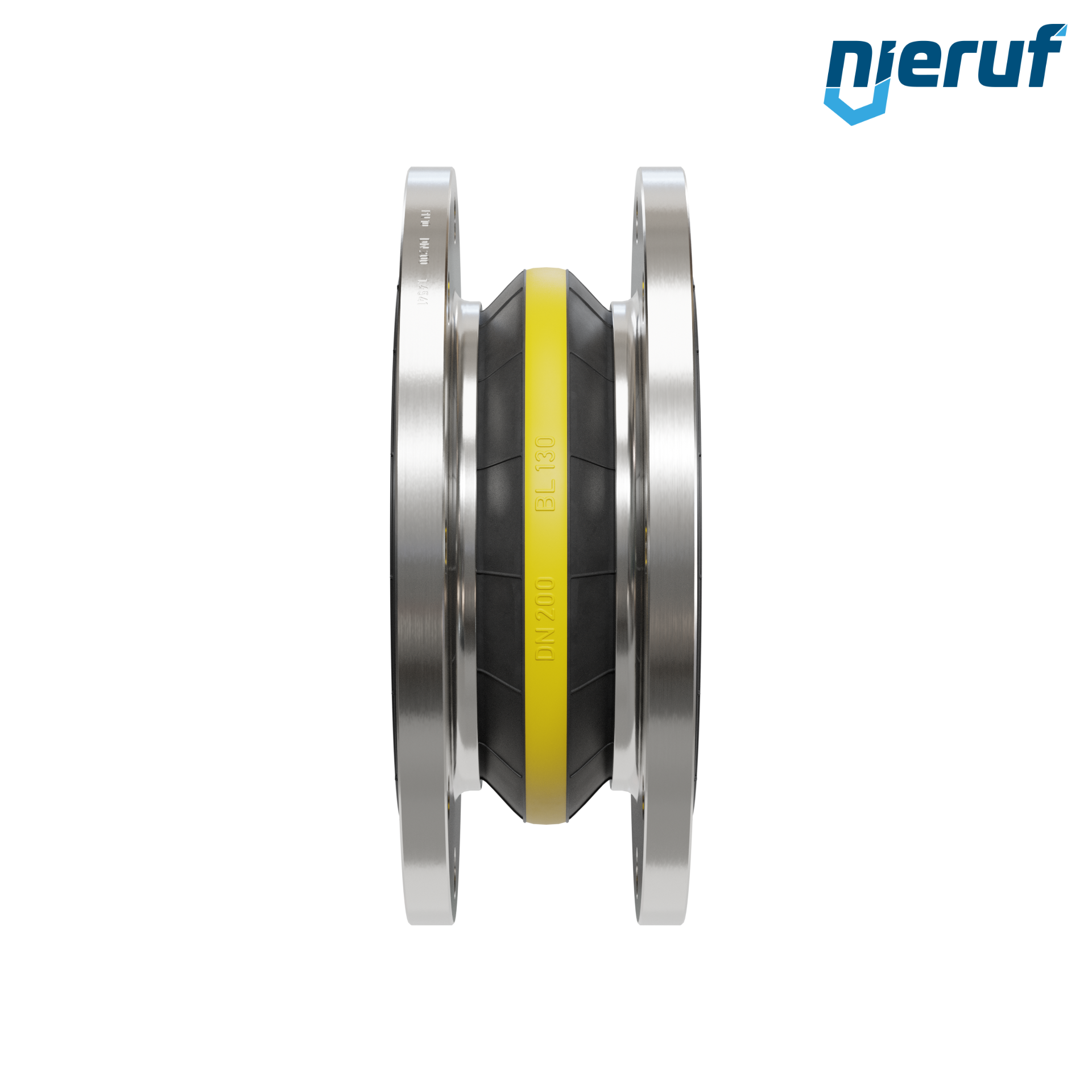 Compensateur en caoutchouc de haute qualité avec joint NBR et brides en acier inoxydable. Le modèle peut être étendu avec un revêtement en PTFE, des anneaux de support de vide et d'autres options sur demande.