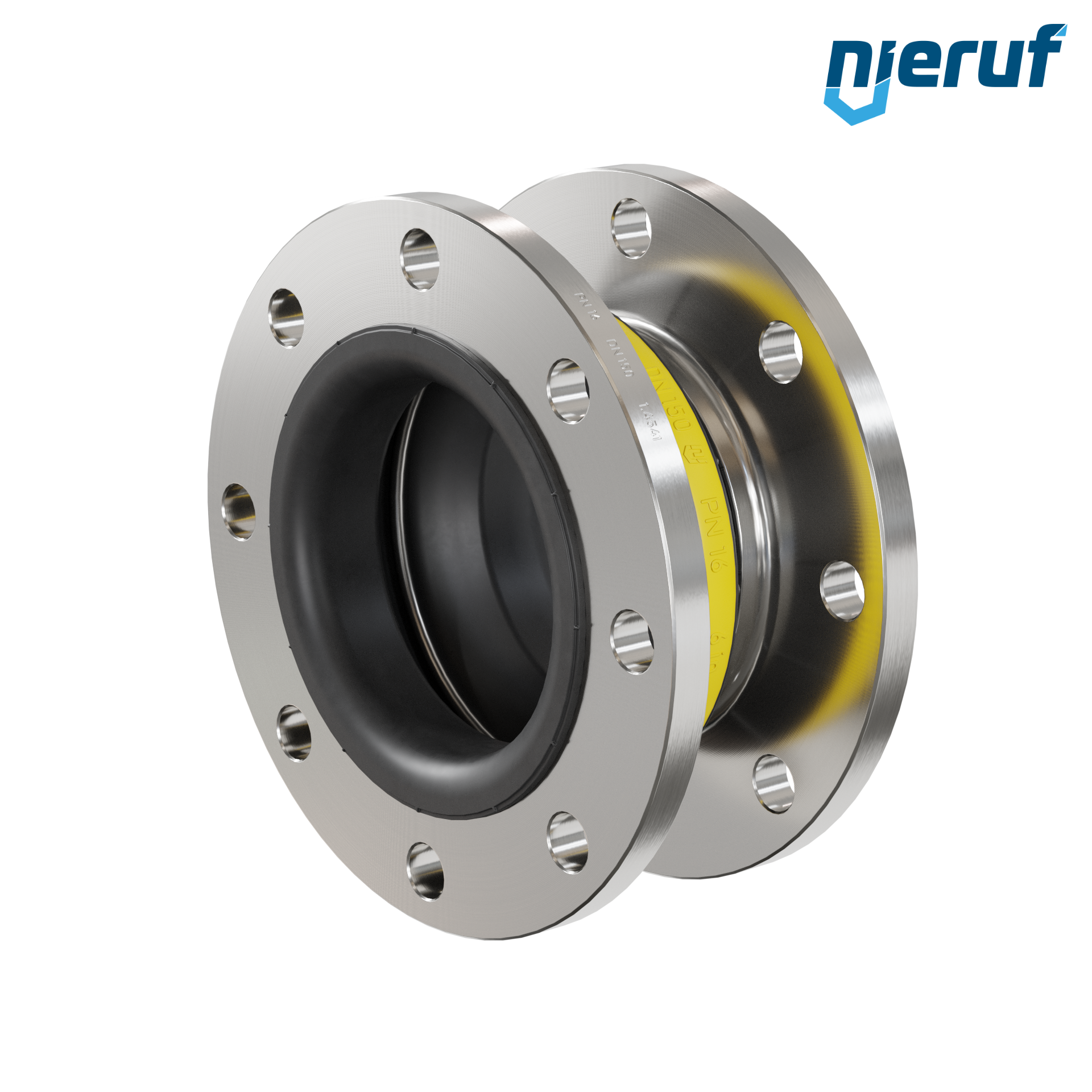 Compensateur en caoutchouc de haute qualité avec joint NBR et brides en acier inoxydable. De plus, ce compensateur est équipé d'une bague de support de vide pour les dépressions plus élevées.