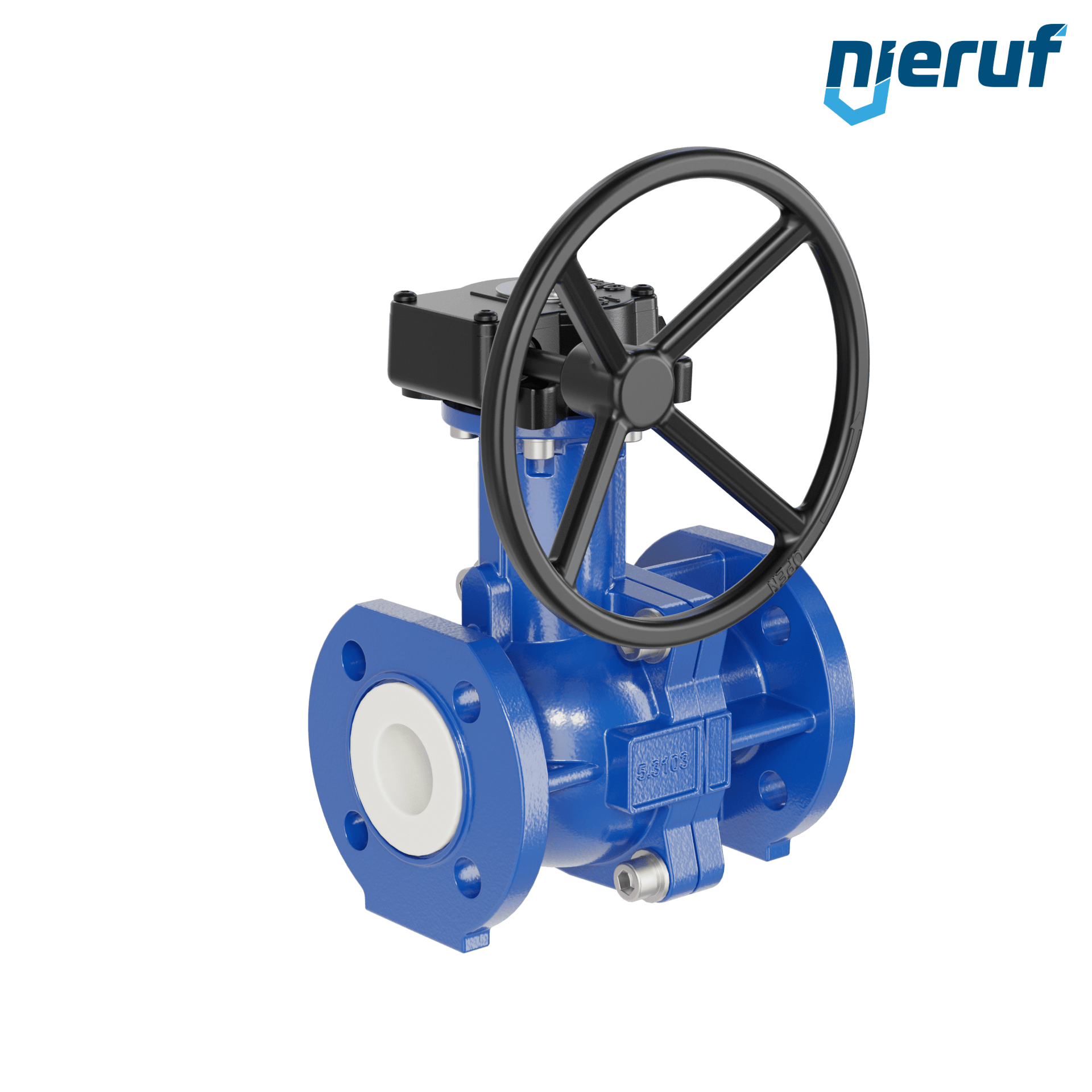 Robinet à boisseau sphérique à bride PFA FK13 DN40 PN10/16 fonte à graphite sphéroïdal 5.3103 Corps PFA Sphère PTFE pour fluides liquides, gazeux et agressifs avec réducteur manuel