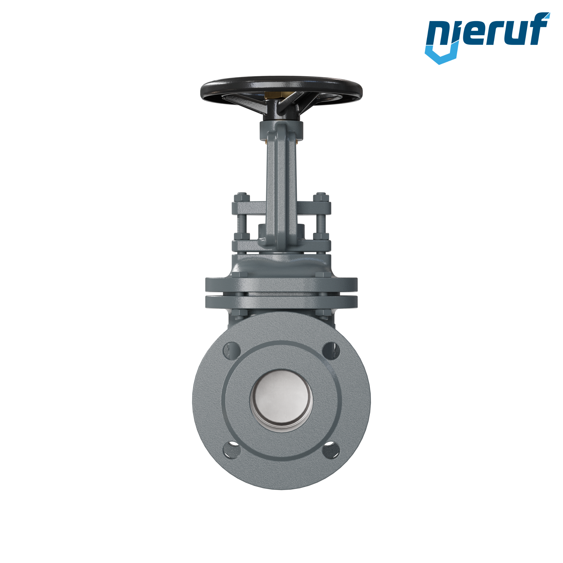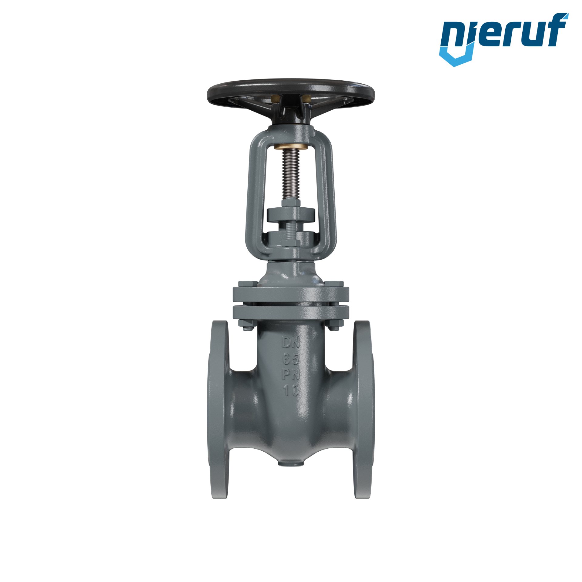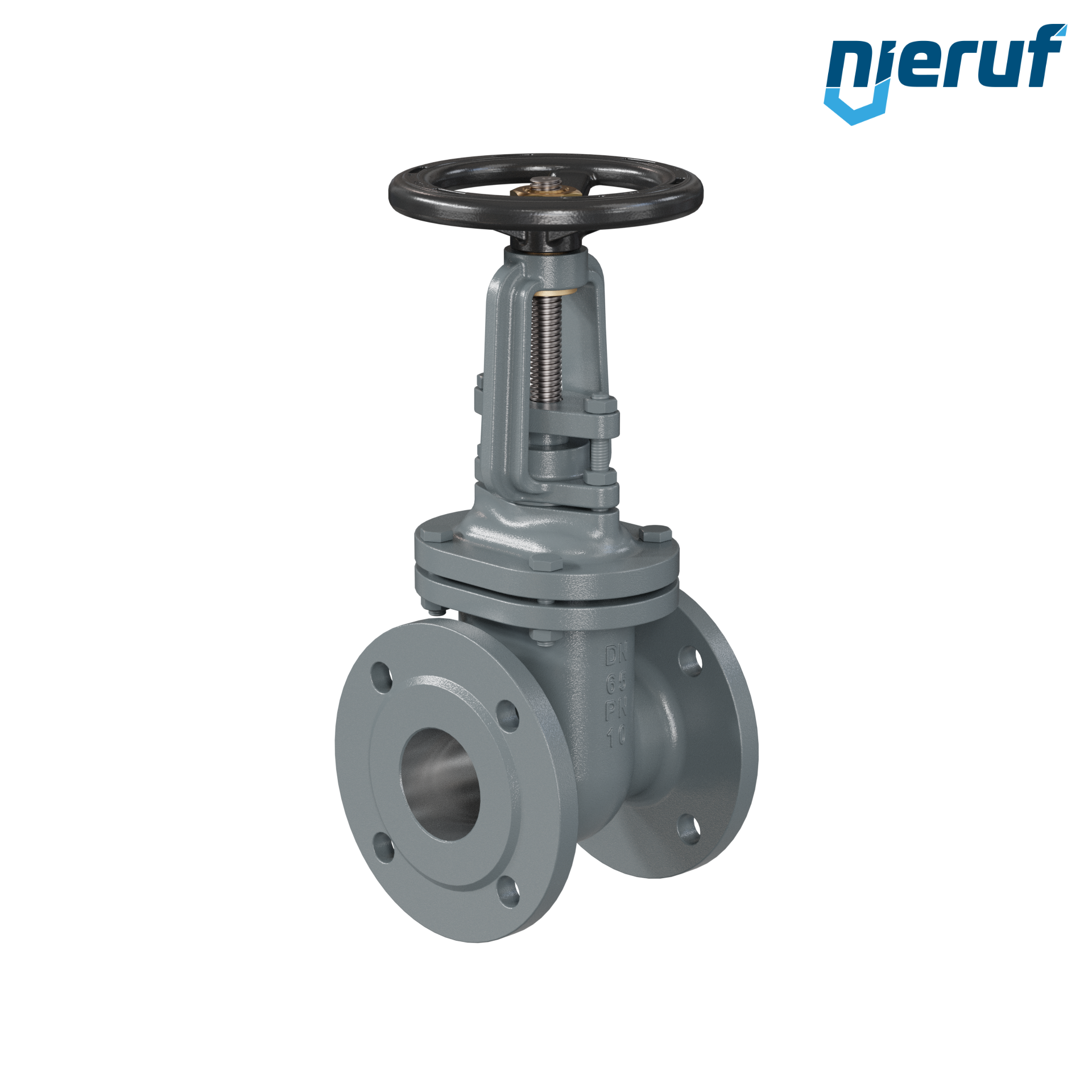vanne à opercule plat en fonte grise à passage droit avec raccordement par bride et tige extérieure ainsi que volant non montant.