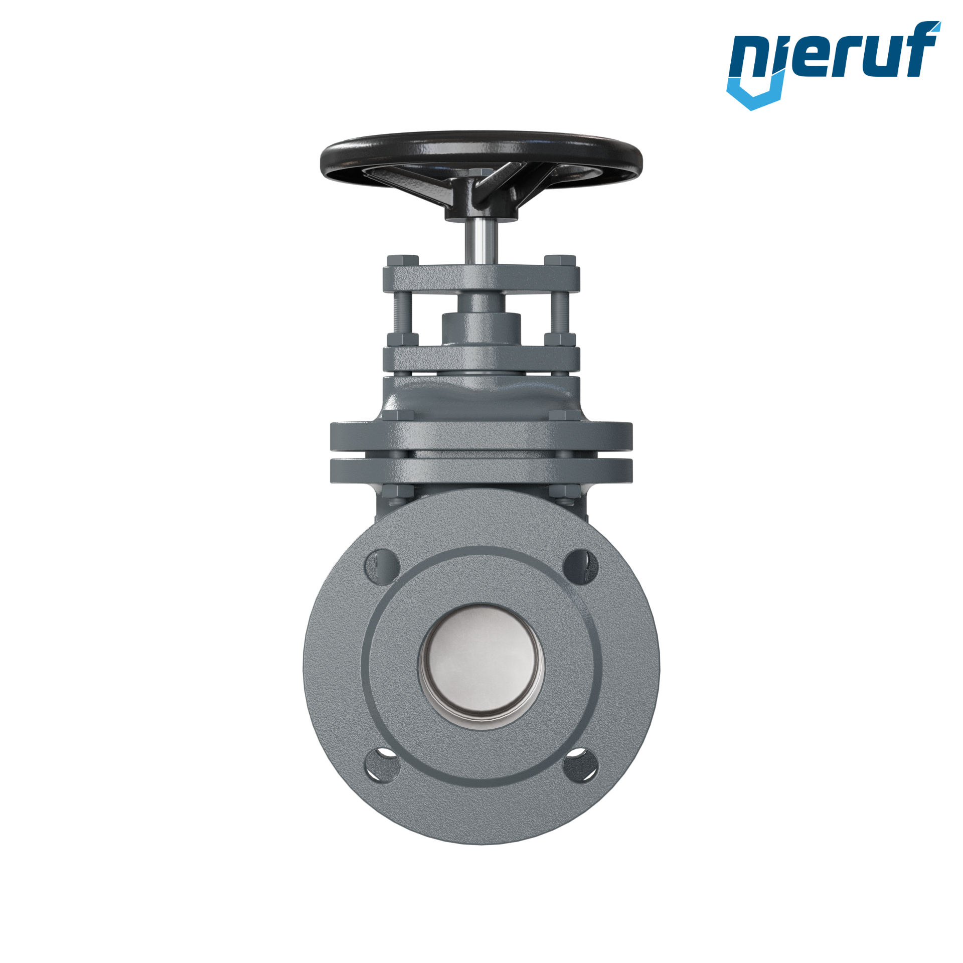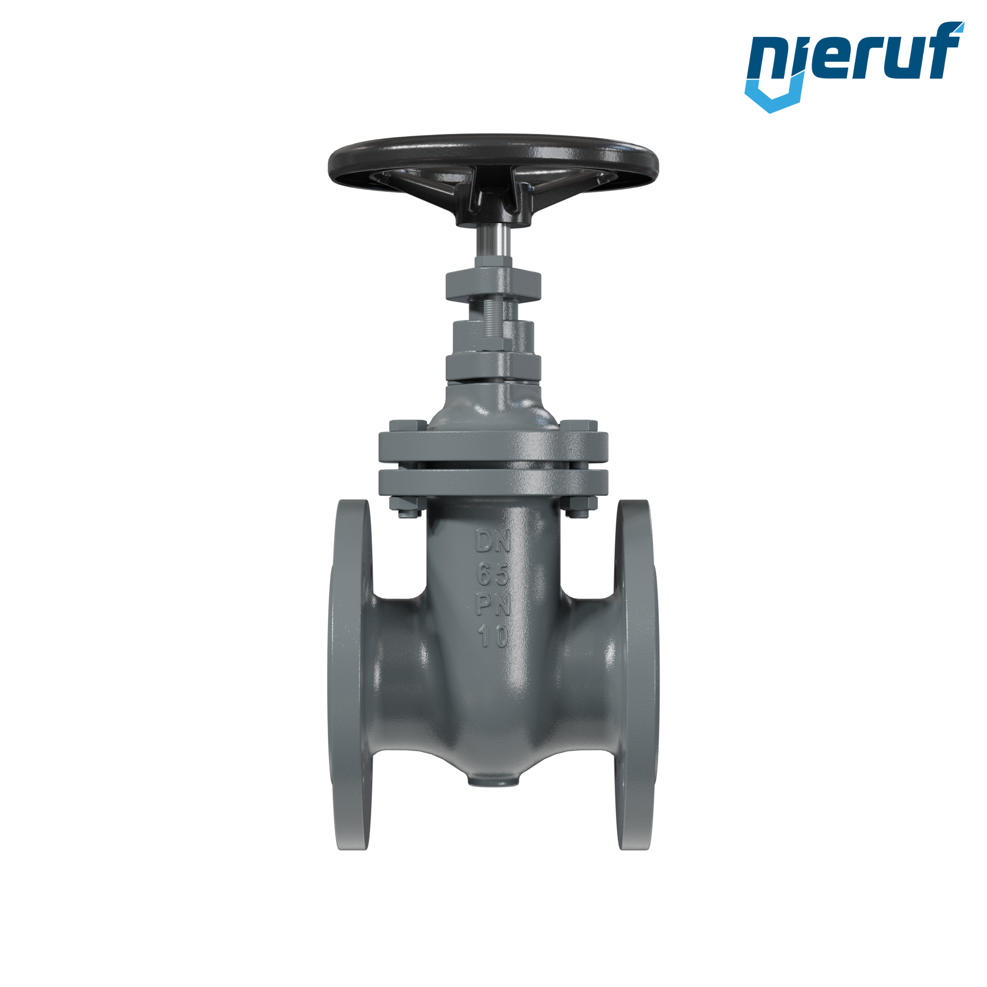 vanne à opercule plat en fonte grise en passage droit avec raccordement par bride et tige intérieure ainsi que volant non montant.