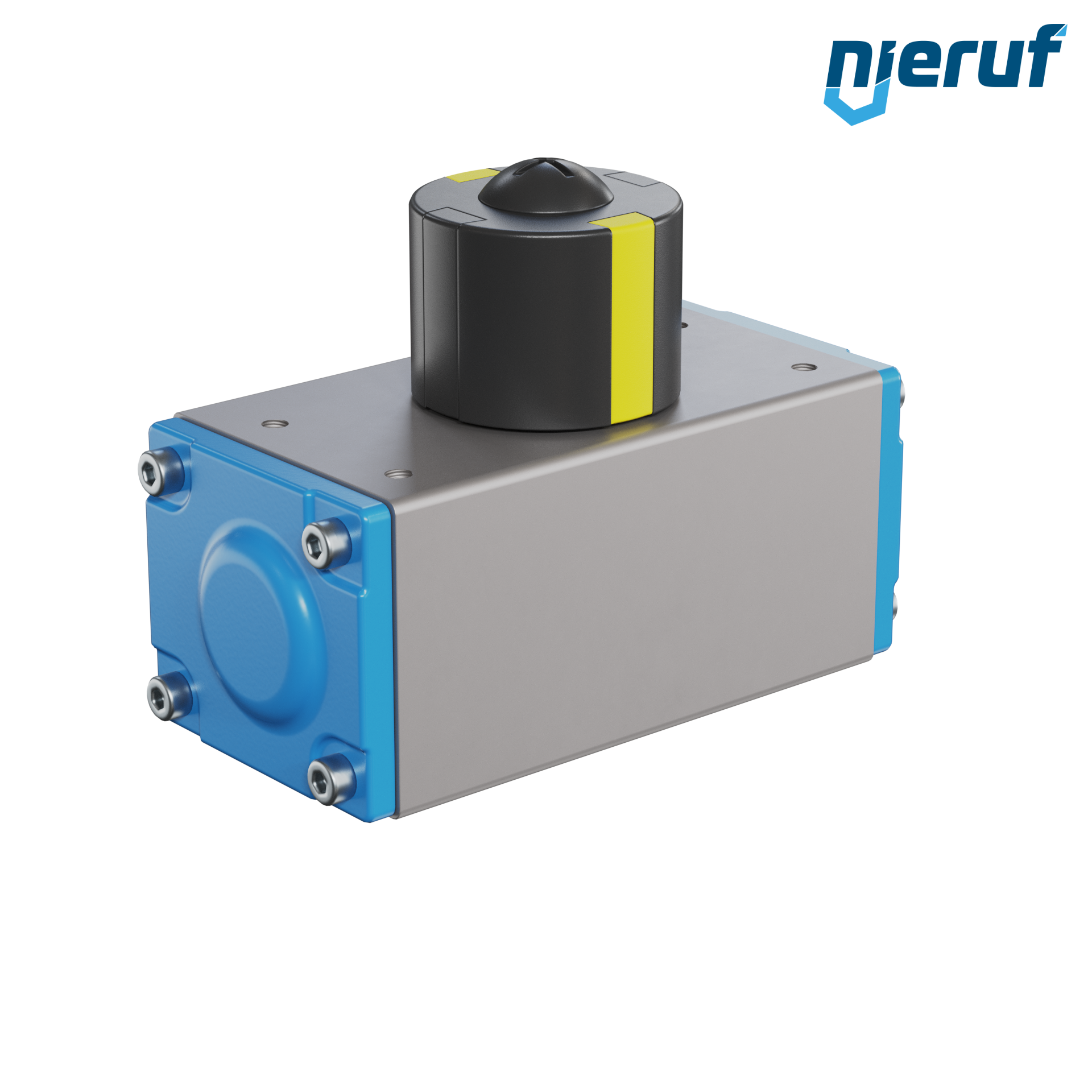 Actionneur pneumatique de conception compacte à double effet pour la commande et le réglage des vannes. Angle de rotation prédéfini de 90° avec indicateur visuel de position.