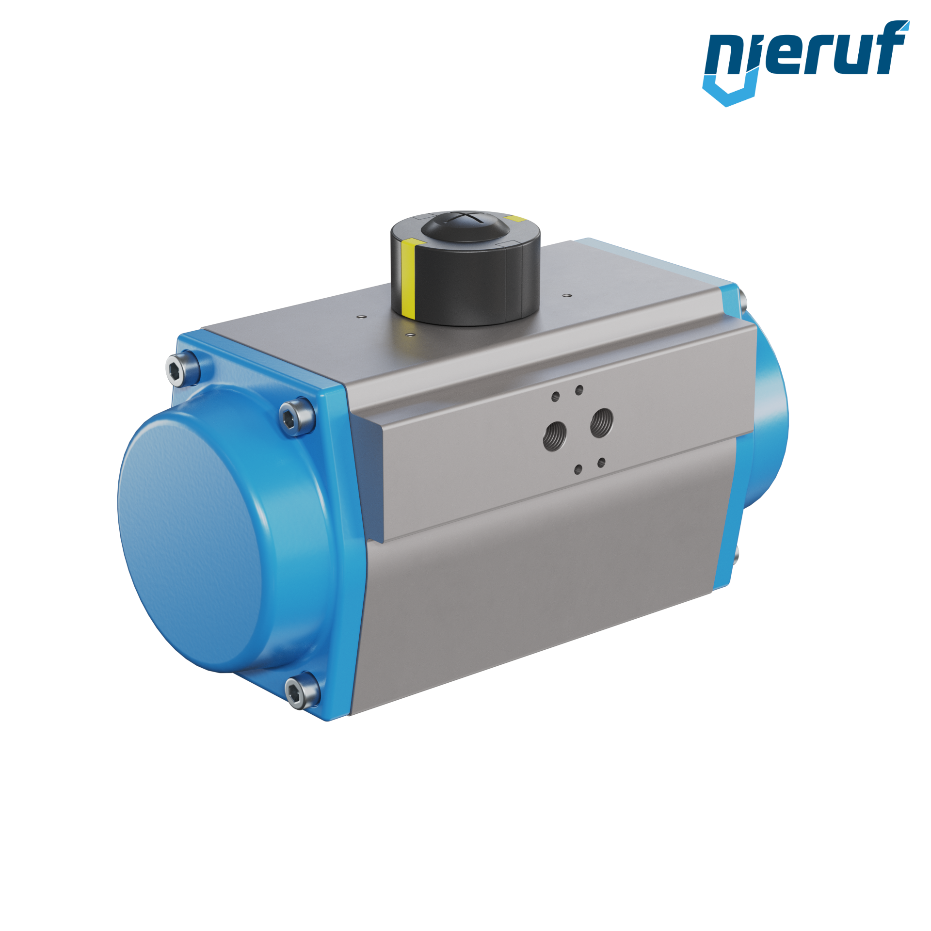 Actionneur pneumatique compact à simple effet à ouverture par ressort pour la commande et la régulation de vannes. Angle de rotation préréglé à 90° avec indicateur visuel de position.