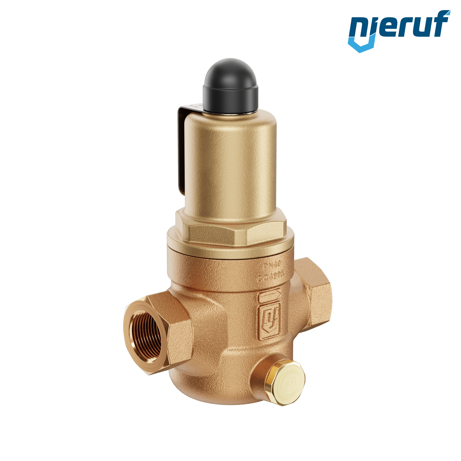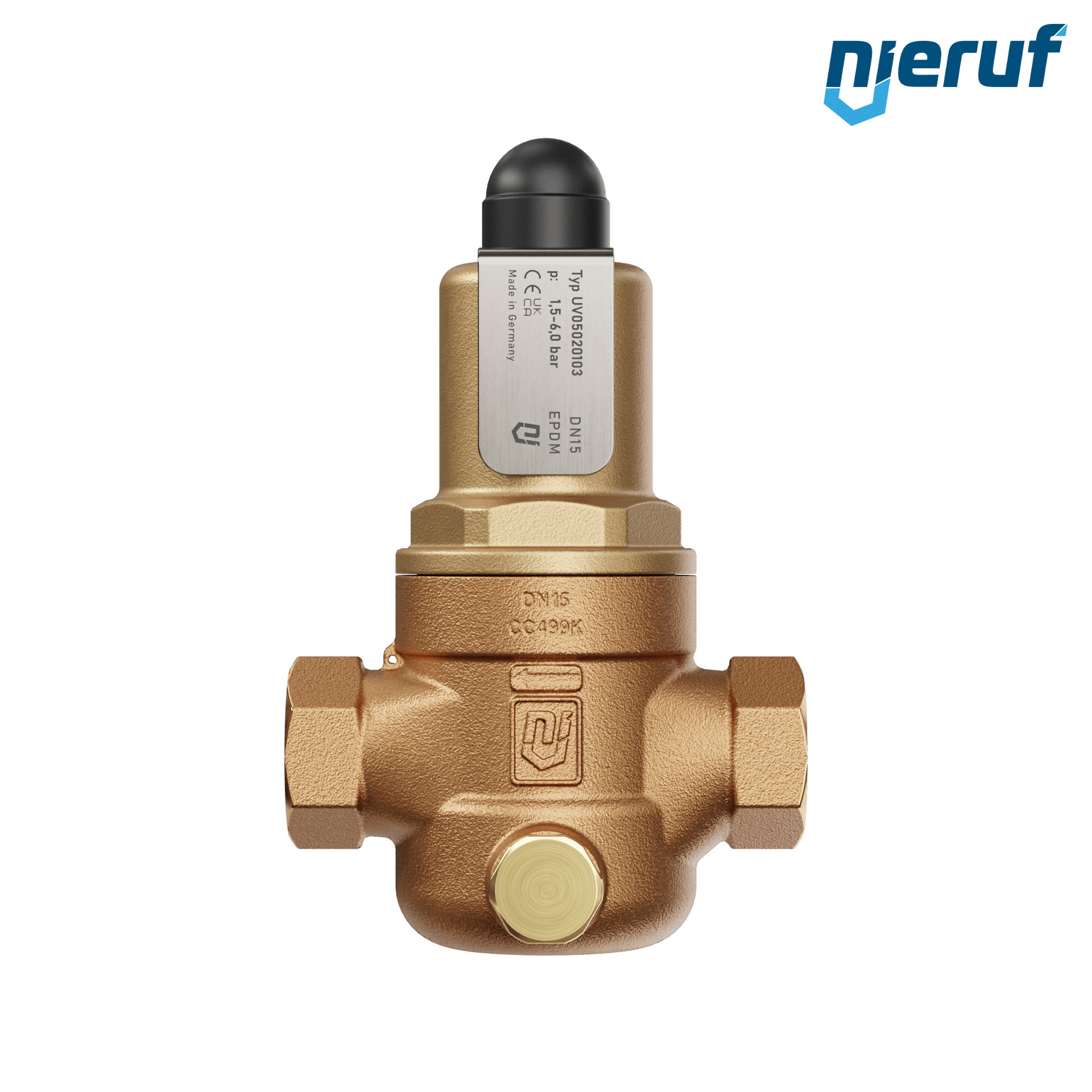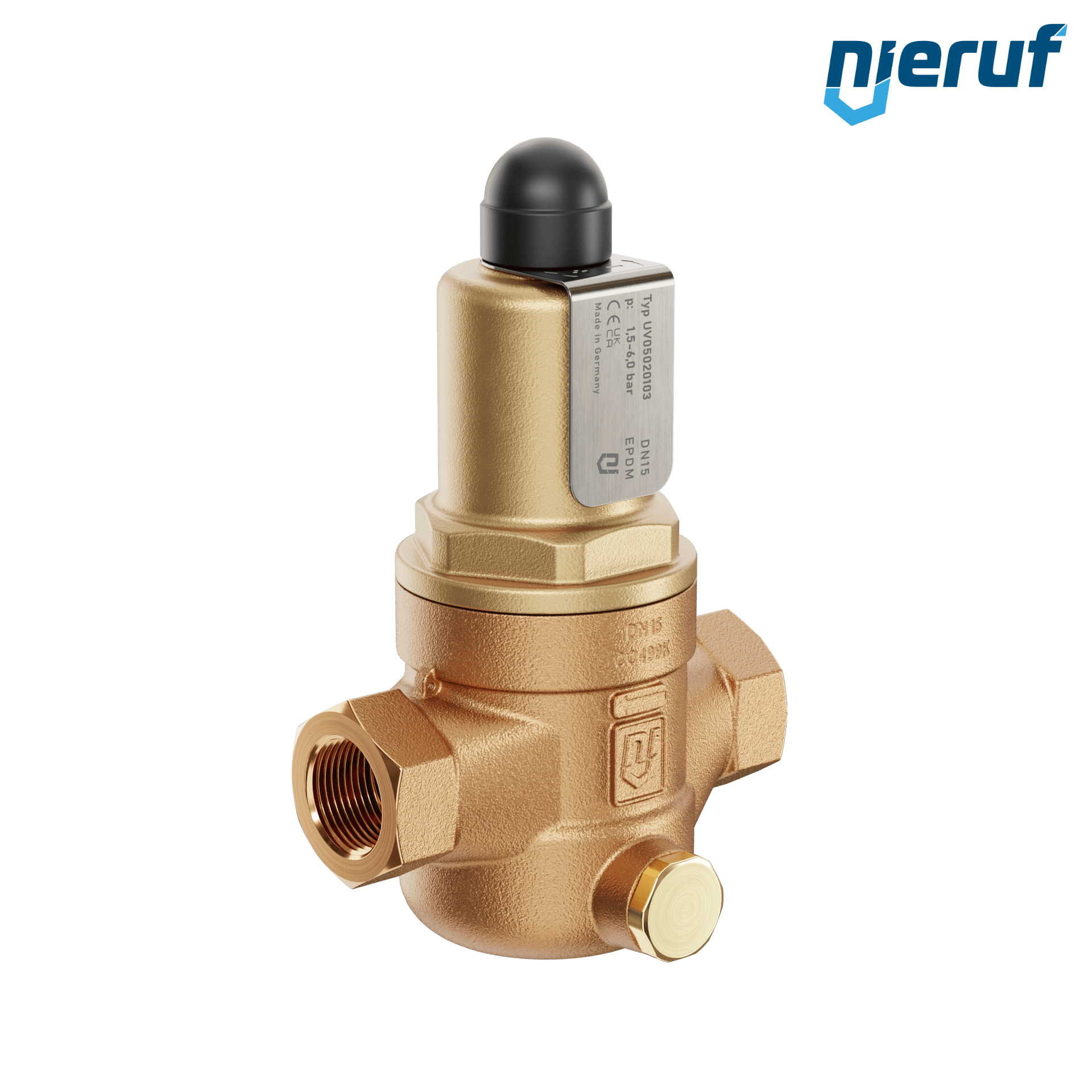 déverseur/soupape de décharge à passage droit 1/2" pouce femelle modèle UV05 en bronze/laiton plage de réglage 1,5 - 6,0 bar joint EPDM pour fluides liquides et gazeux