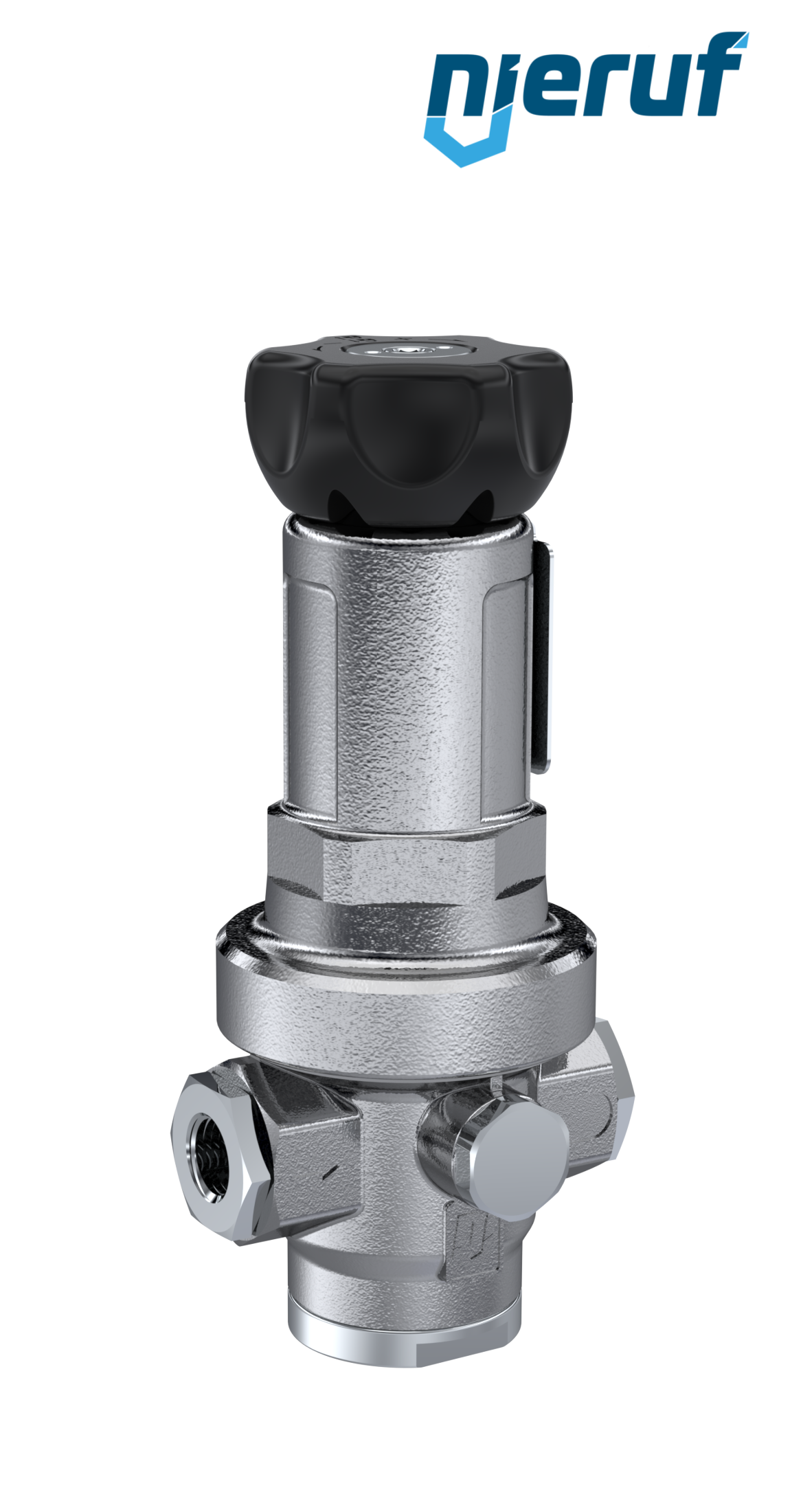Réducteur de pression à piston de haute qualité avec bague d'appui. Réglage de la pression à l'aide d'une tige non montante et d'un raccord manométrique 1/4" pouce.
