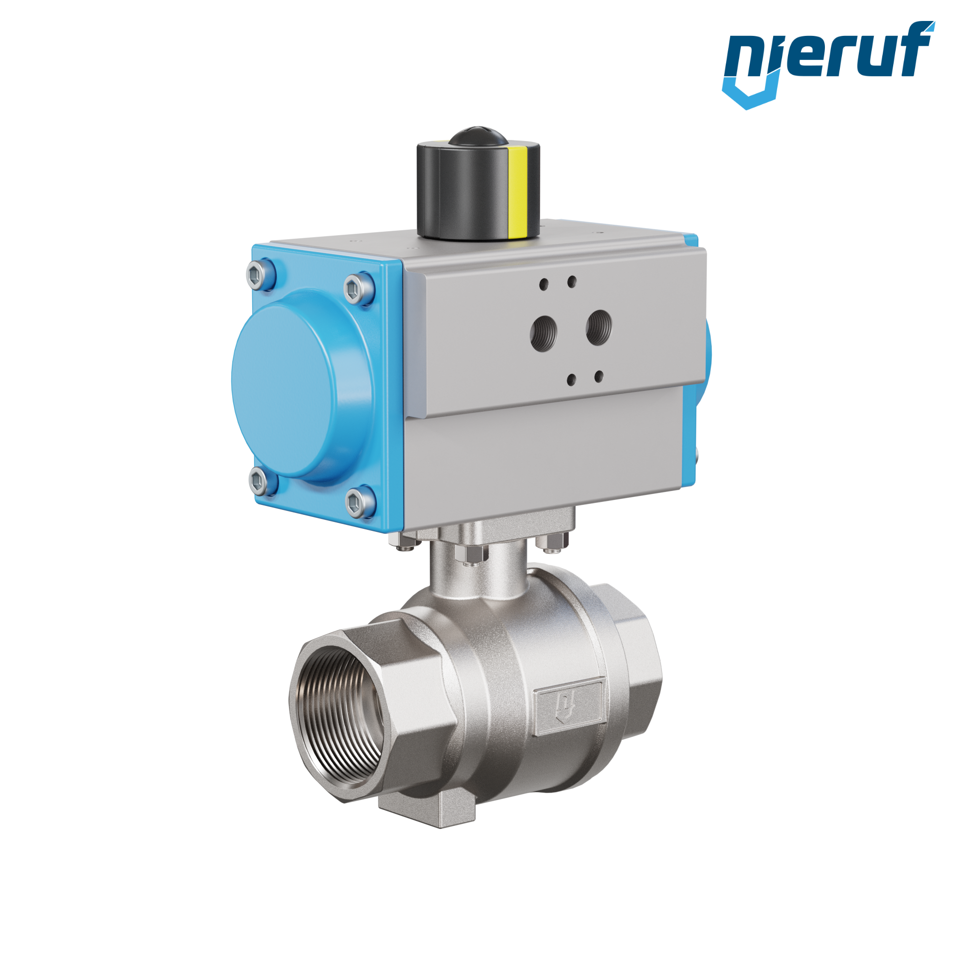 pour ce robinet à boisseau sphérique automatique en acier inoxydable de haute qualité avec manchon et actionnement rotatif pneumatique (GS = simple effet), l'actionneur est positionné directement sur la robinet à boisseau sphérique et ce dernier est actionné par de air comprimé filtré.
