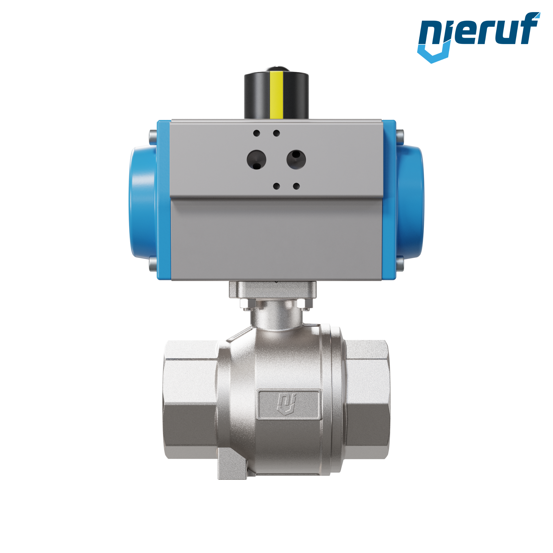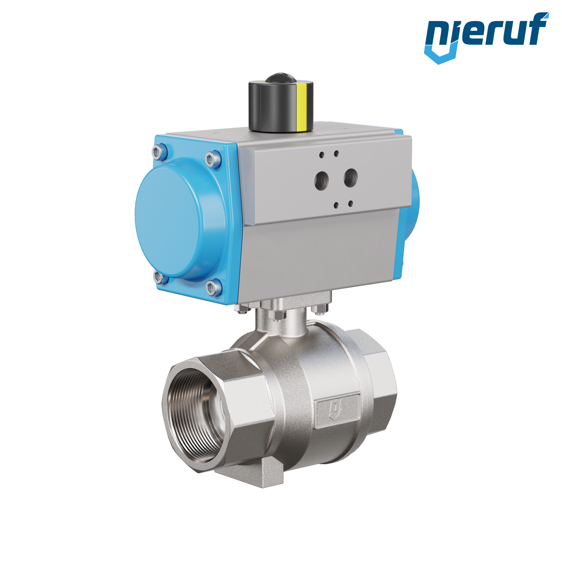 pour ce robinet à boisseau sphérique automatique en acier inoxydable de haute qualité avec manchon et actionnement rotatif pneumatique (GS = simple effet), l'actionneur est positionné directement sur la robinet à boisseau sphérique et est actionnée par de l'air comprimé filtré.