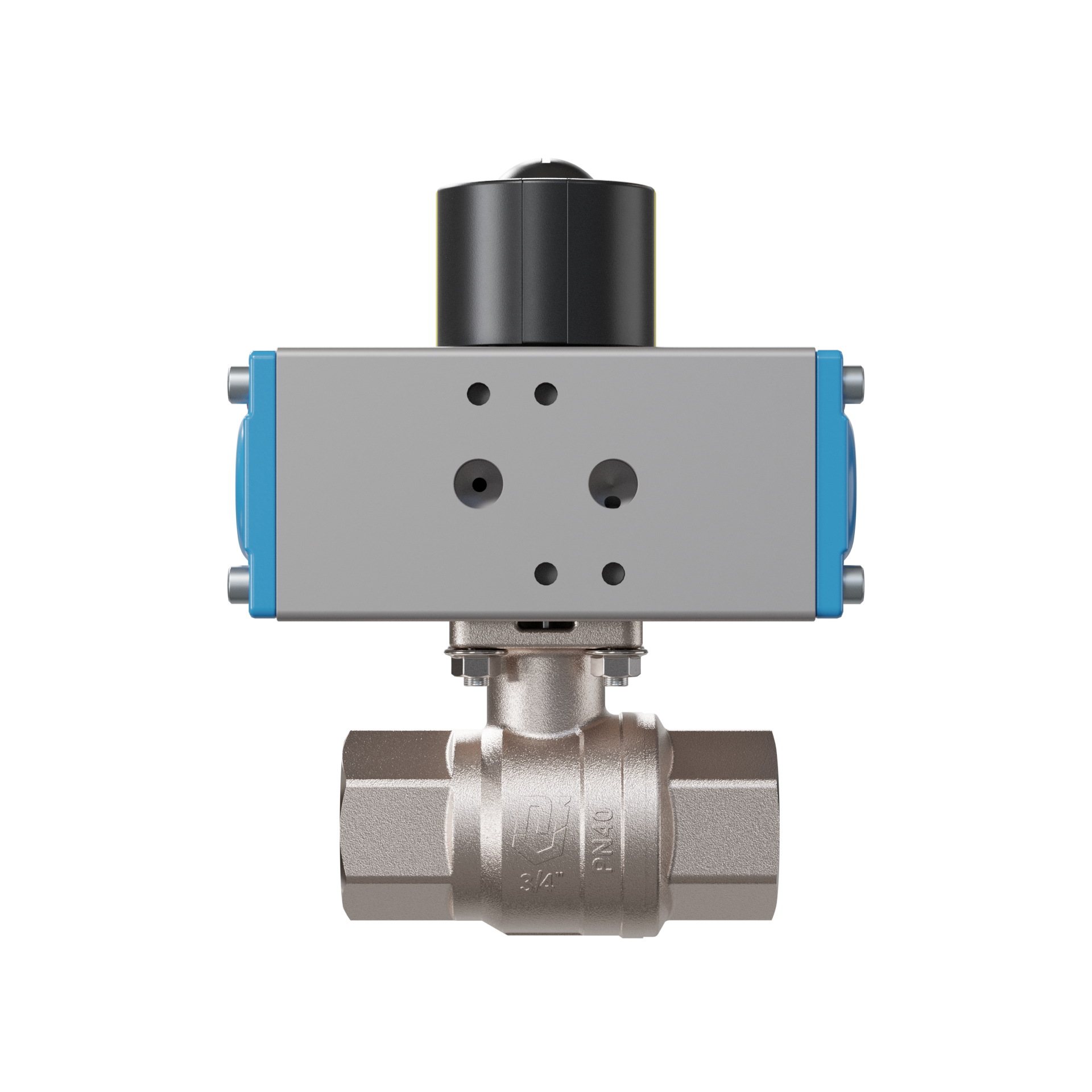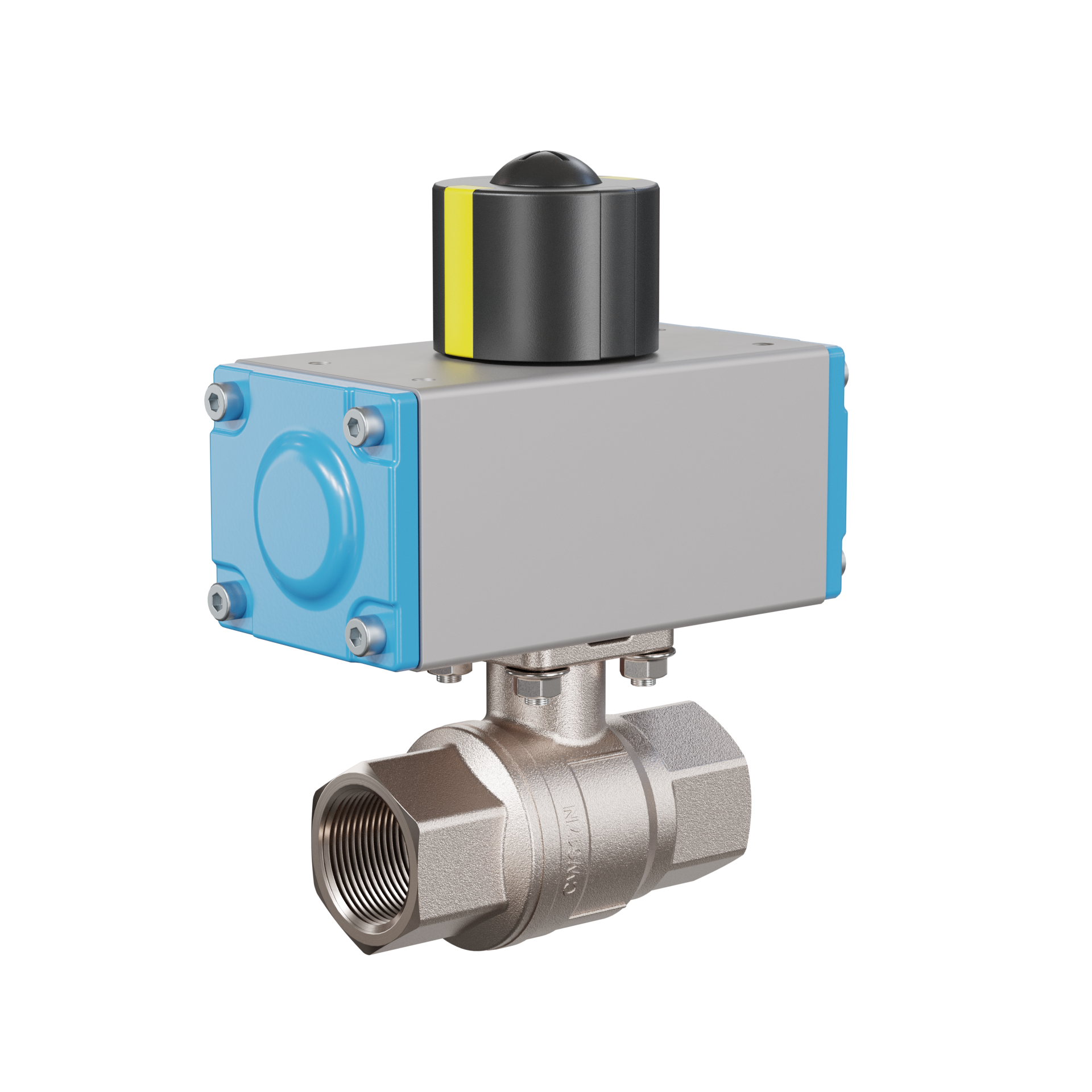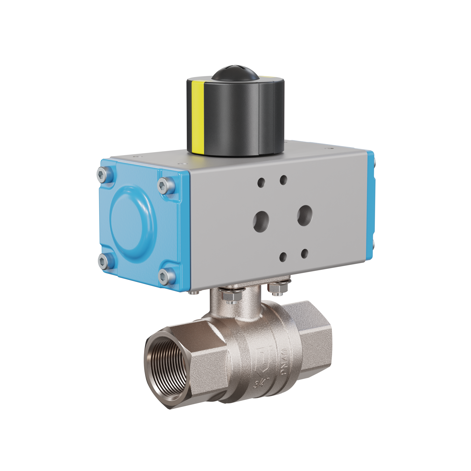 pour ce robinet à boisseau sphérique automatique de haute qualité en laiton avec manchon et actionnement rotatif pneumatique (GD = double effet), l'actionneur est positionné directement sur la robinet à boisseau sphérique et celle-ci est actionnée par de l'air comprimé filtré.