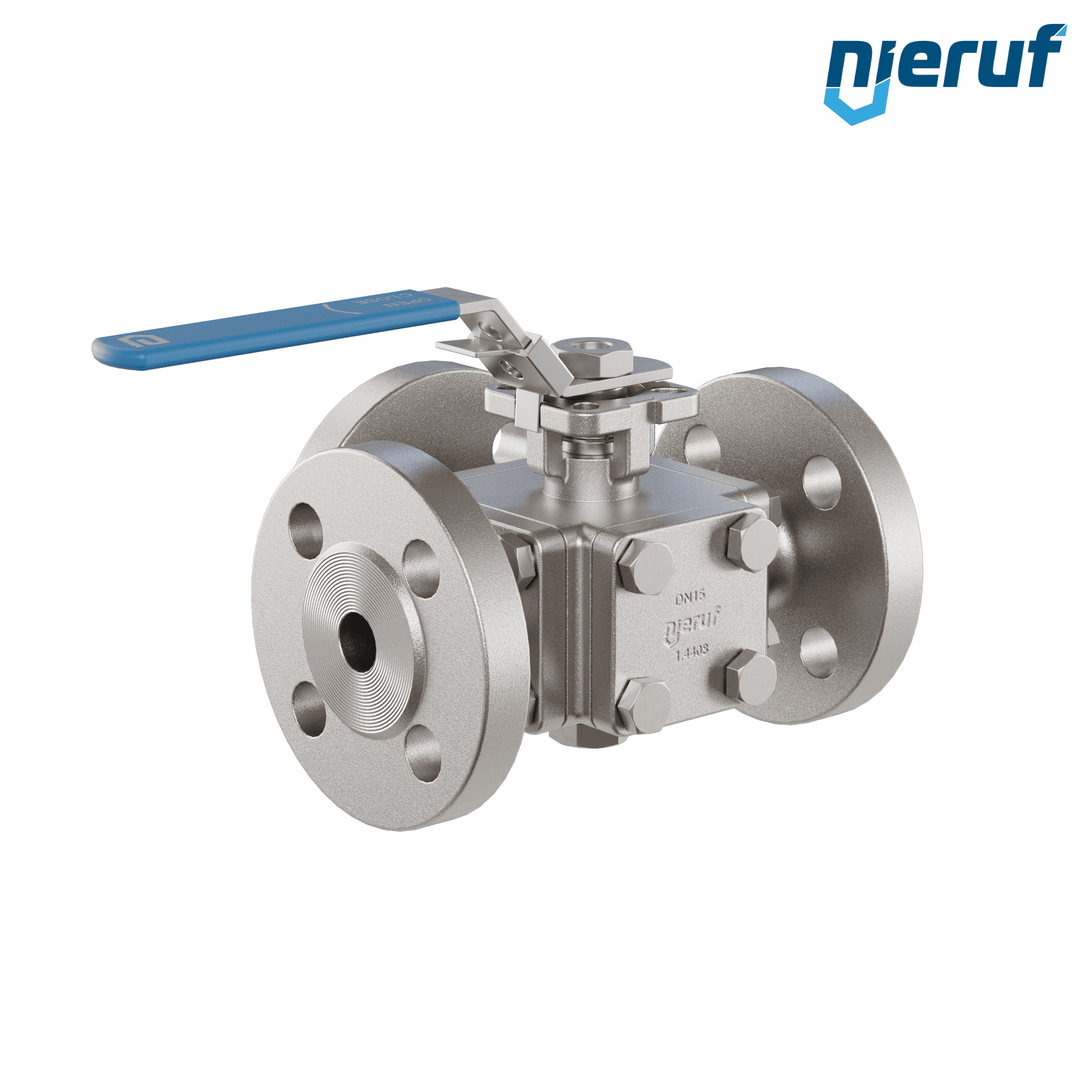 robinet à boisseau sphérique à brides 3 voies en acier inoxydable DN15 PN16/40 FK09 corps en acier inoxydable 1.4408 sphère en acier inoxydable 1.4408 joint TFM 1600 / PTFE lumière en L