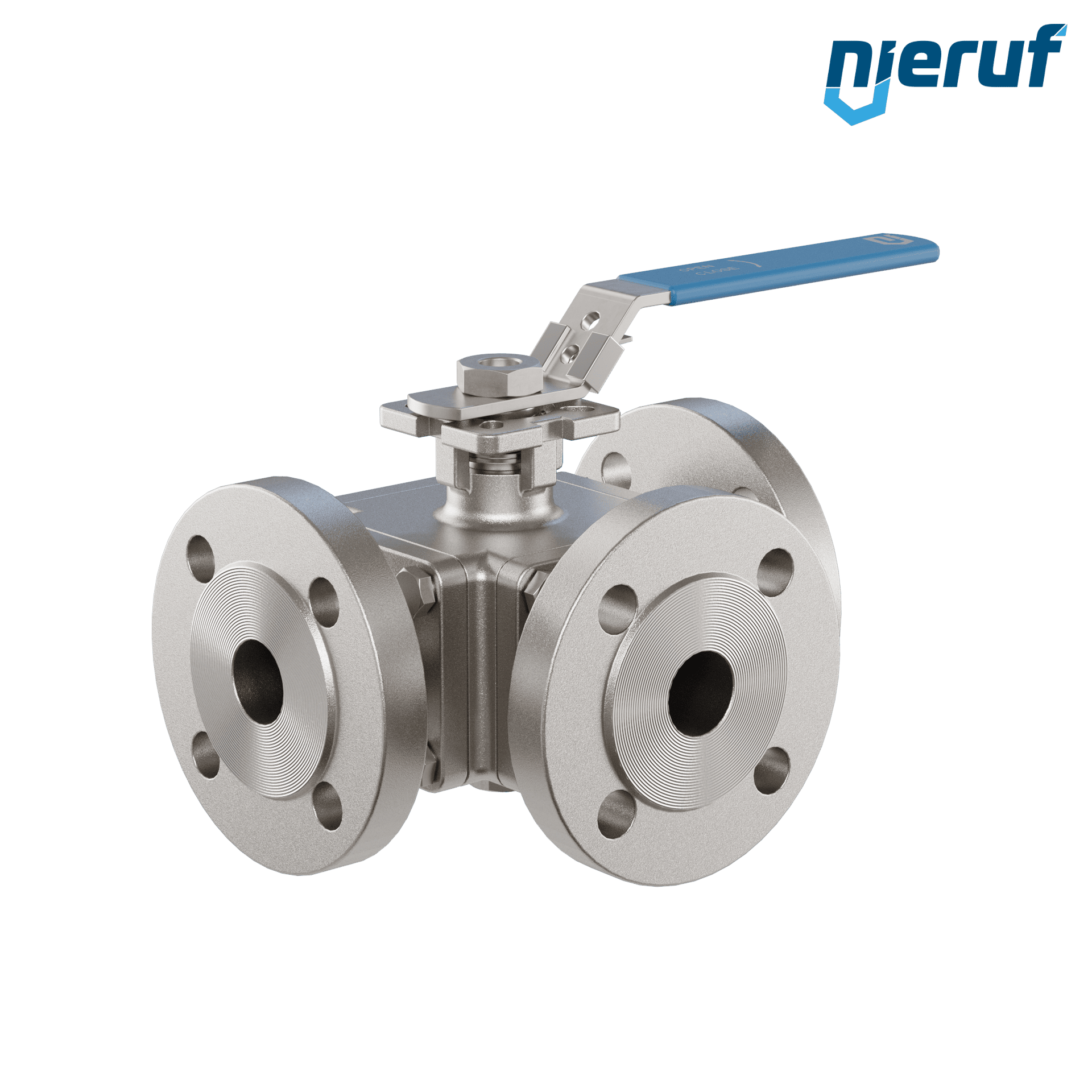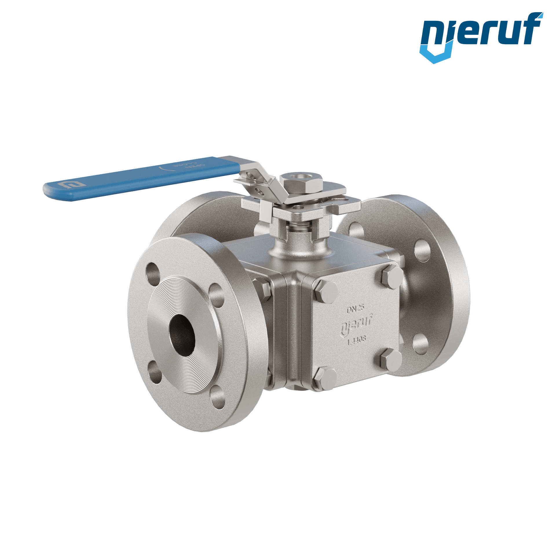 robinet à boisseau sphérique à brides 3 voies en acier inoxydable DN25 PN16/40 FK09 corps en acier inoxydable 1.4408 sphère en acier inoxydable 1.4408 joint TFM 1600 / PTFE lumière en L