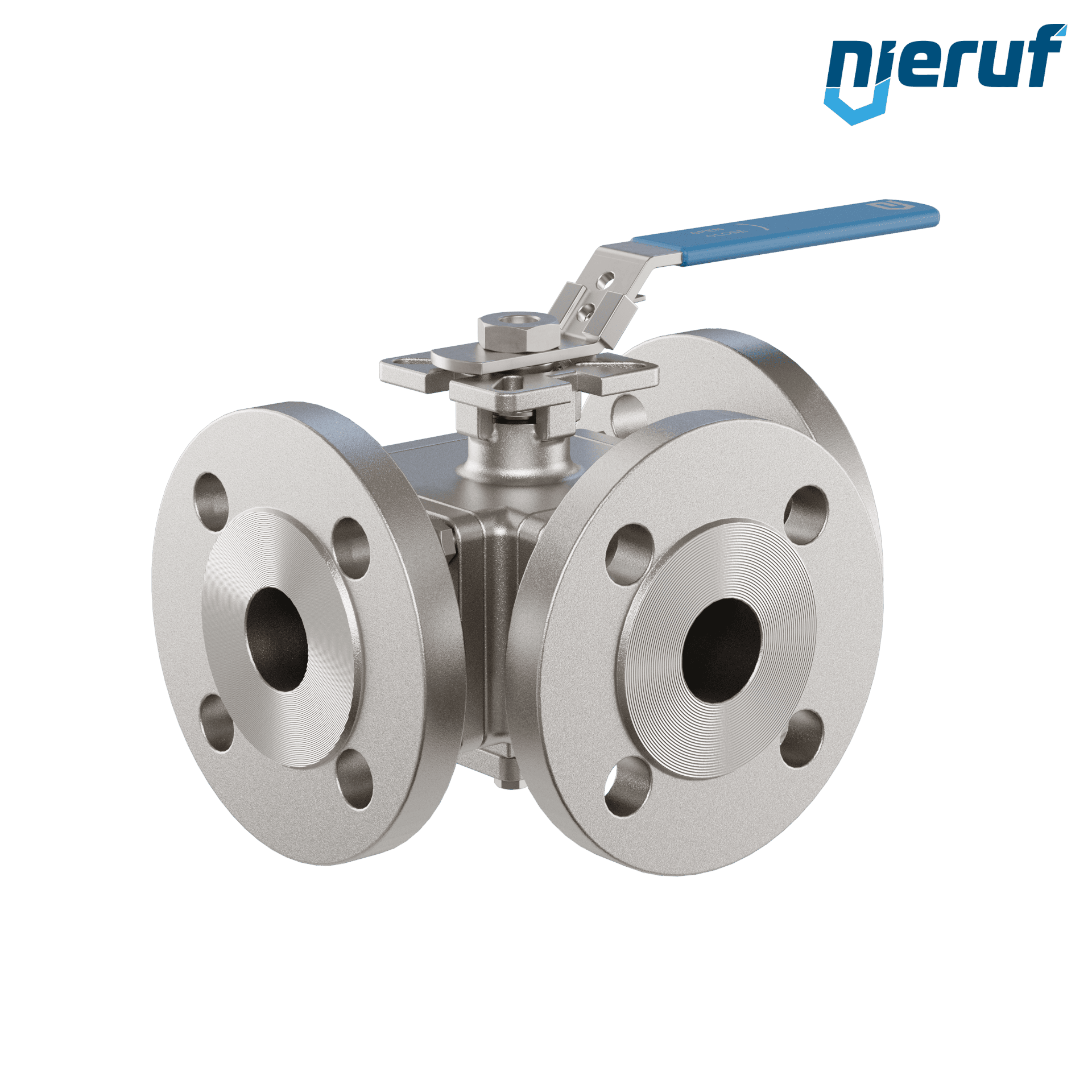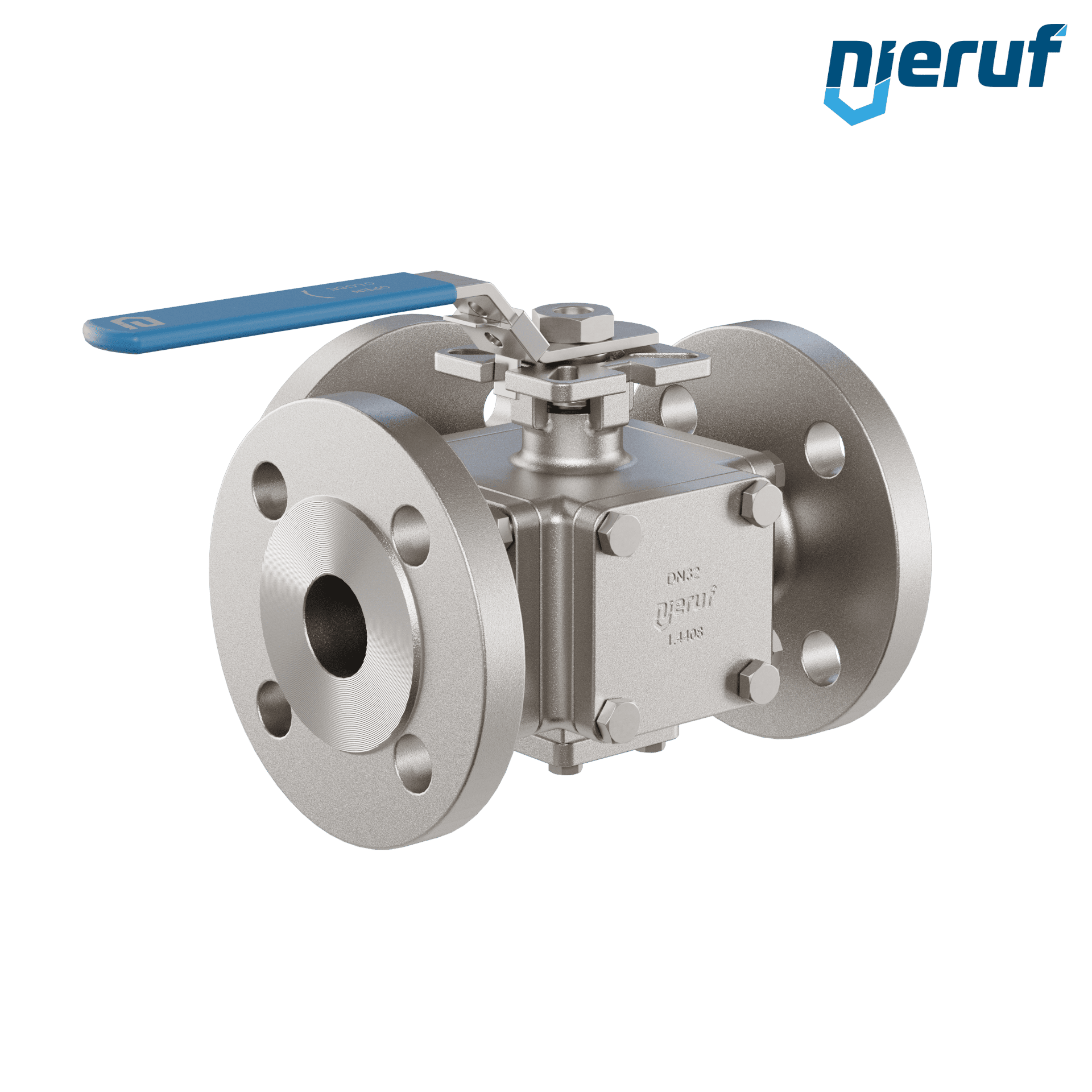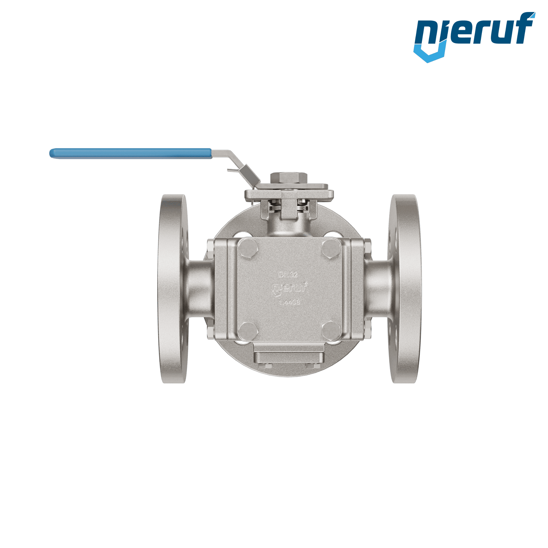robinet à boisseau sphérique à brides 3 voies en acier inoxydable DN32 PN16/40 FK09 corps en acier inoxydable 1.4408 sphère en acier inoxydable 1.4408 joint TFM 1600 / PTFE lumière en T