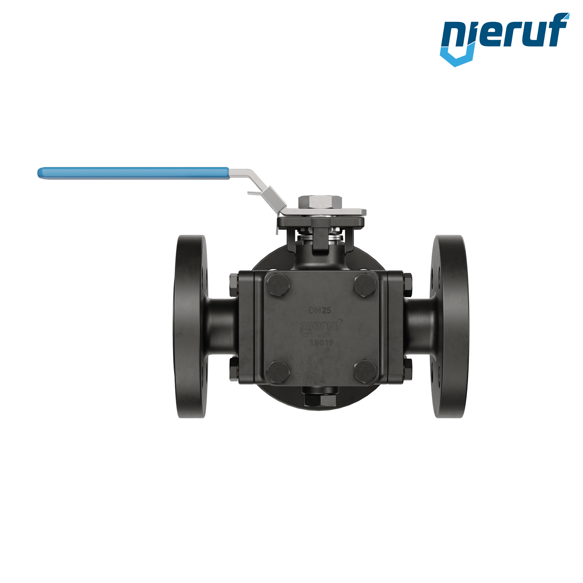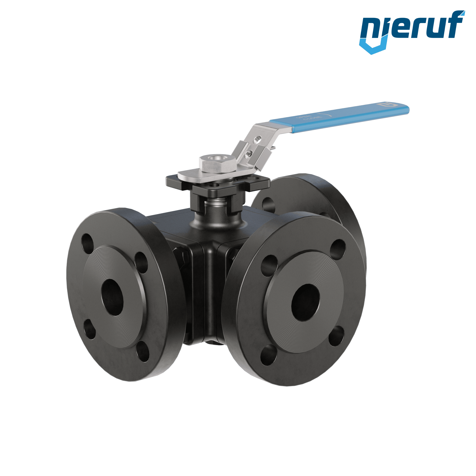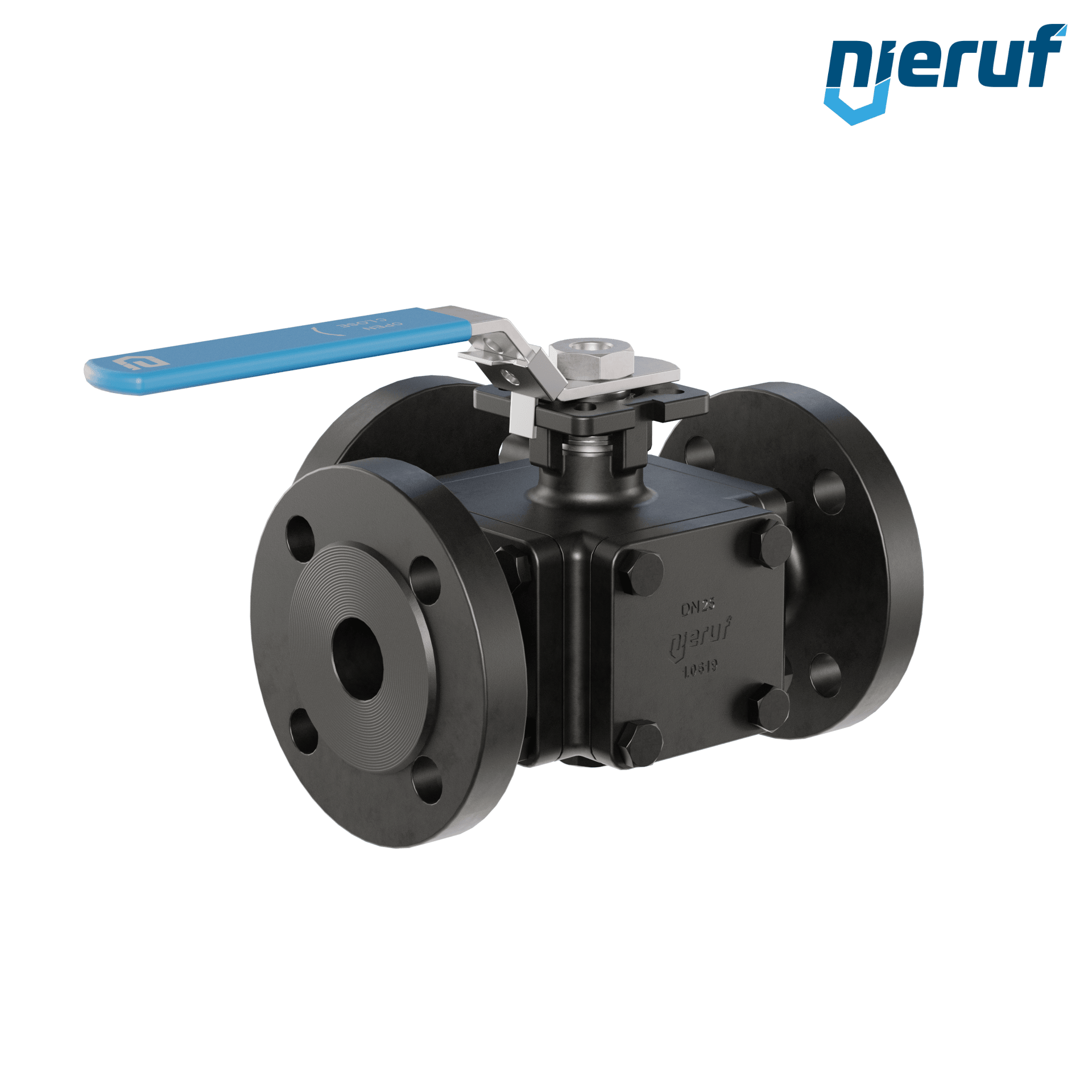ce robinet à boisseau sphérique à brides à trois voies de haute qualité, en acier moulé, avec couvercle et bride de montage selon la norme DIN ISO 5211, possède les homologations / certificats suivants : PED 97/23 / EG, catégorie 3 module H, TA-air 2002. ce robinet à boisseau sphérique possède une lumière T (T3).