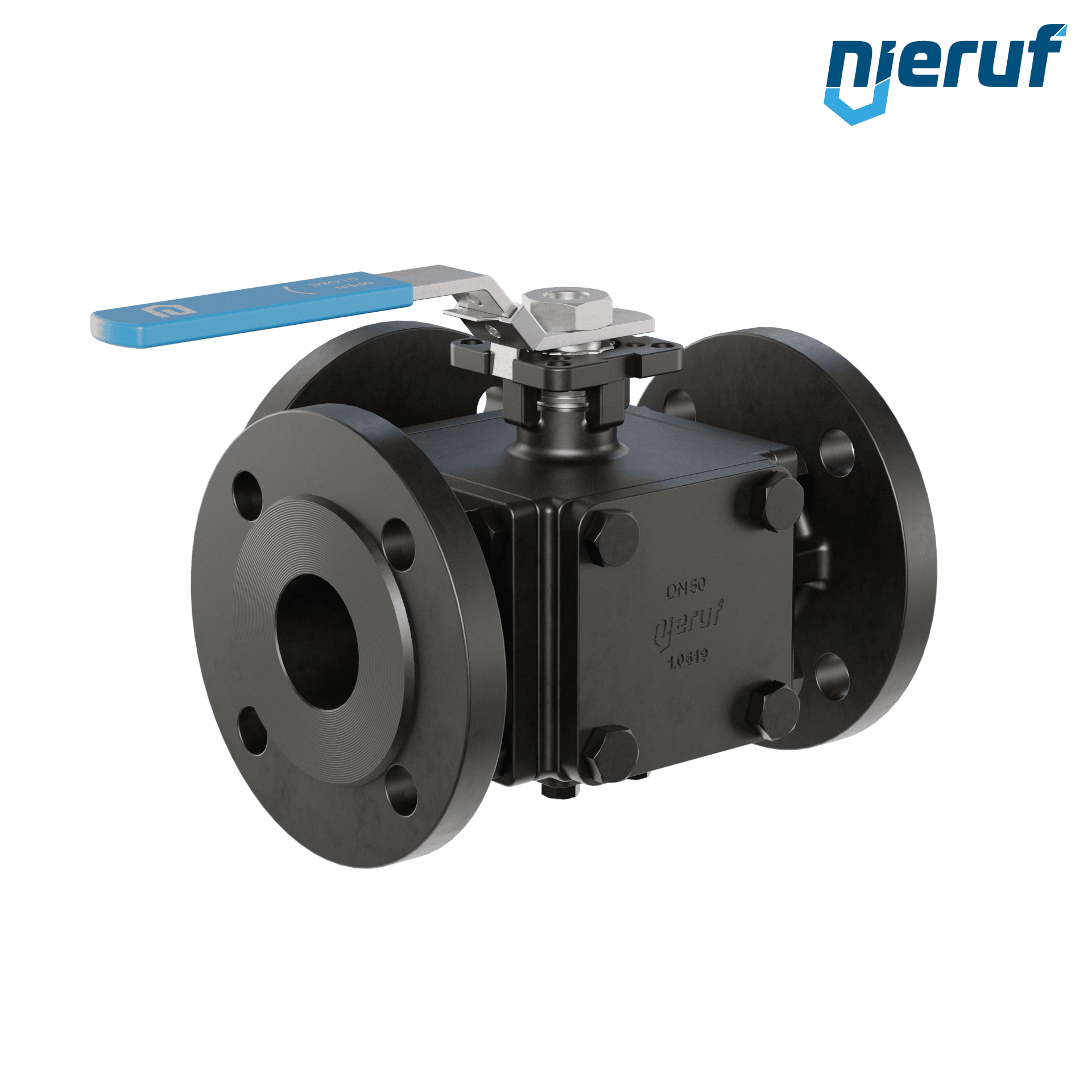 robinet à boisseau sphérique à brides 3 voies DN50 PN16/40 FK08 corps en acier moulé 1.0619 sphère en acier moulé 1.4308 joint TFM 1600 / PTFE lumière en L