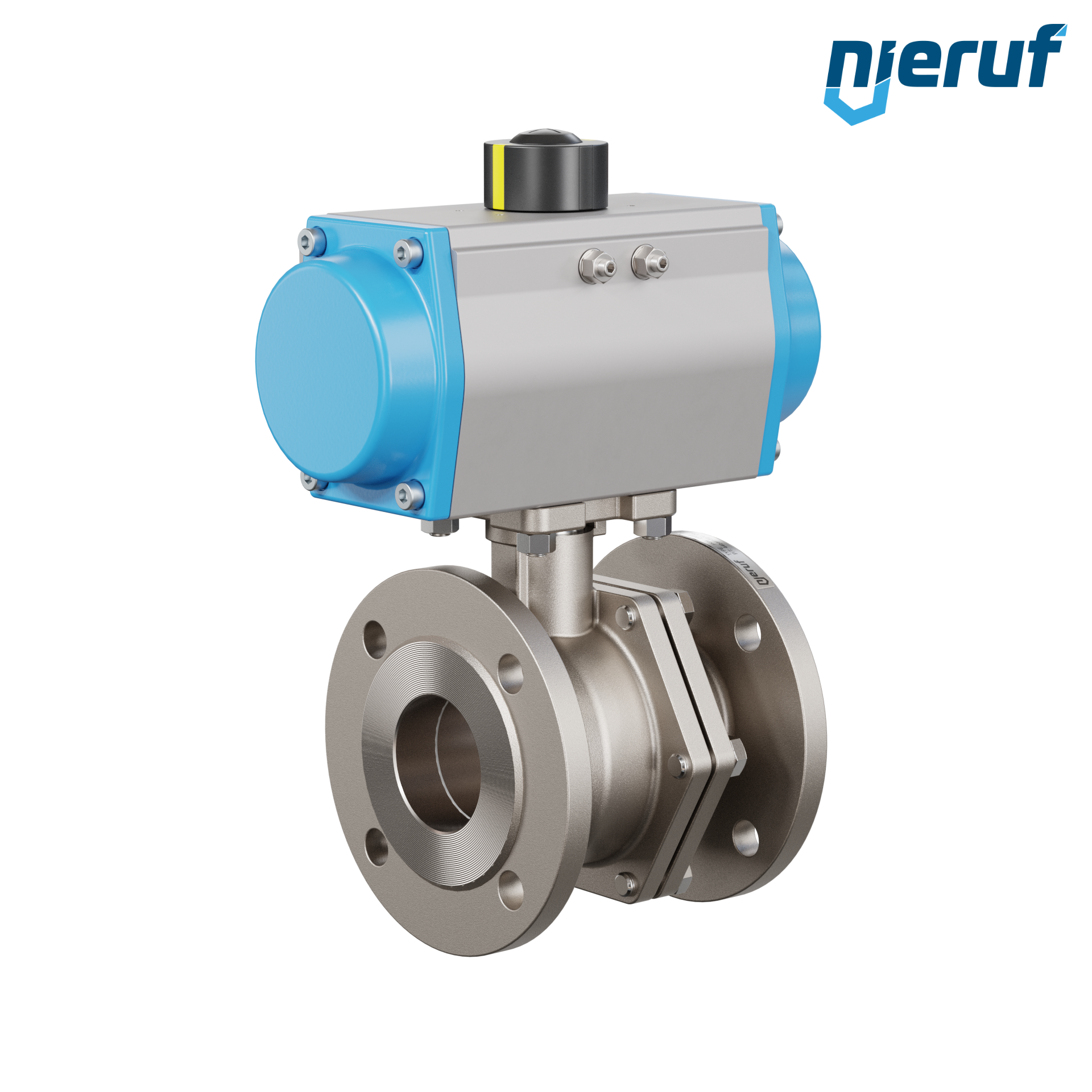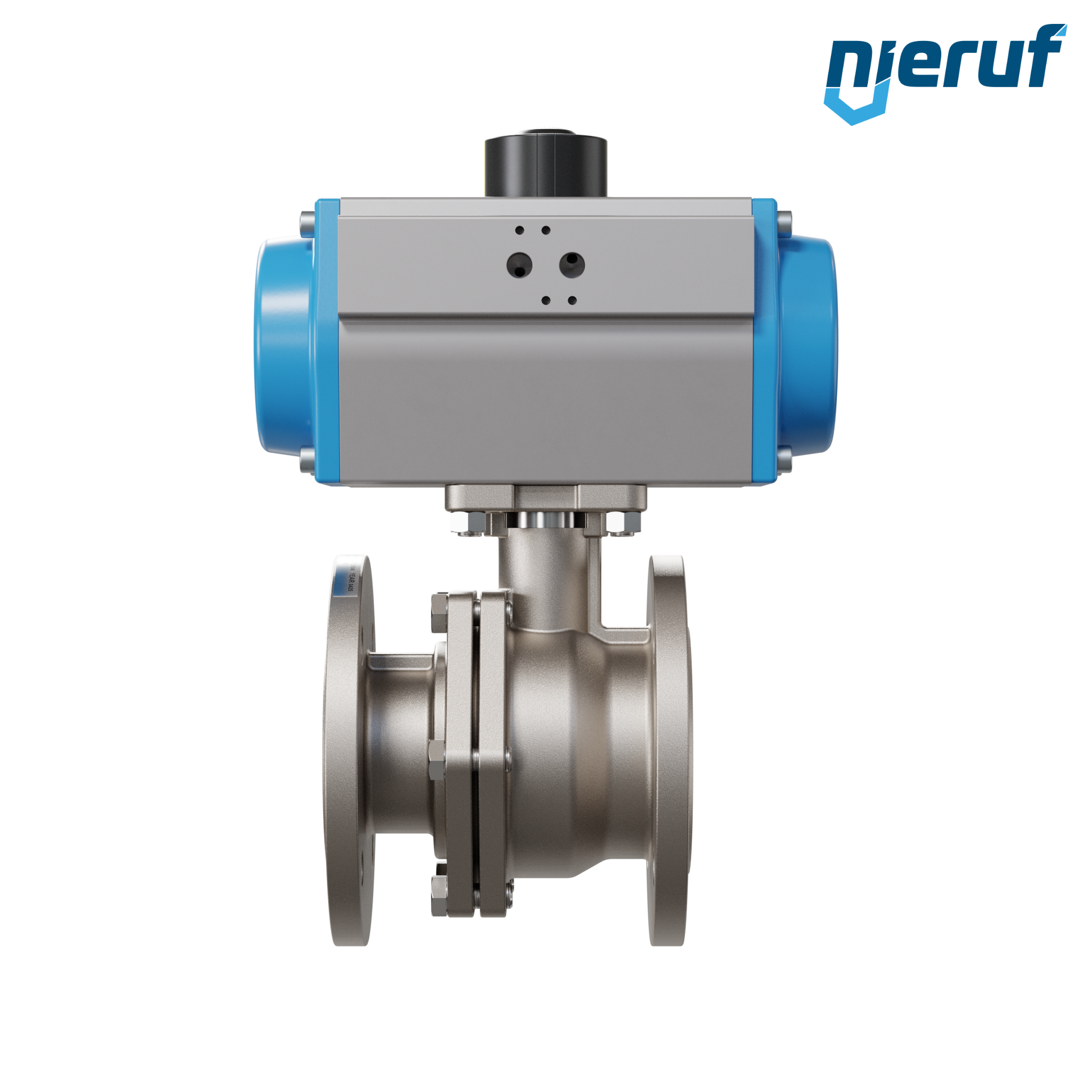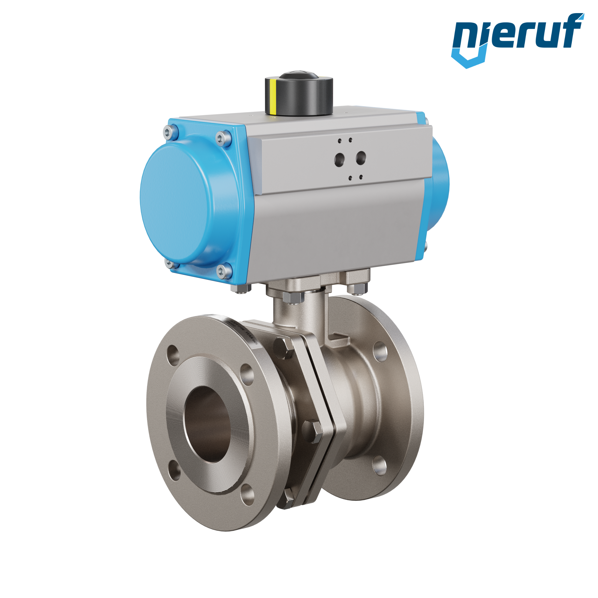 pour ce robinet à boisseau sphérique automatique à brides en acier inoxydable de haute qualité avec manchon et entraînement rotatif pneumatique (GD = double effet), l'actionneur est positionné directement sur la robinet à boisseau sphérique.