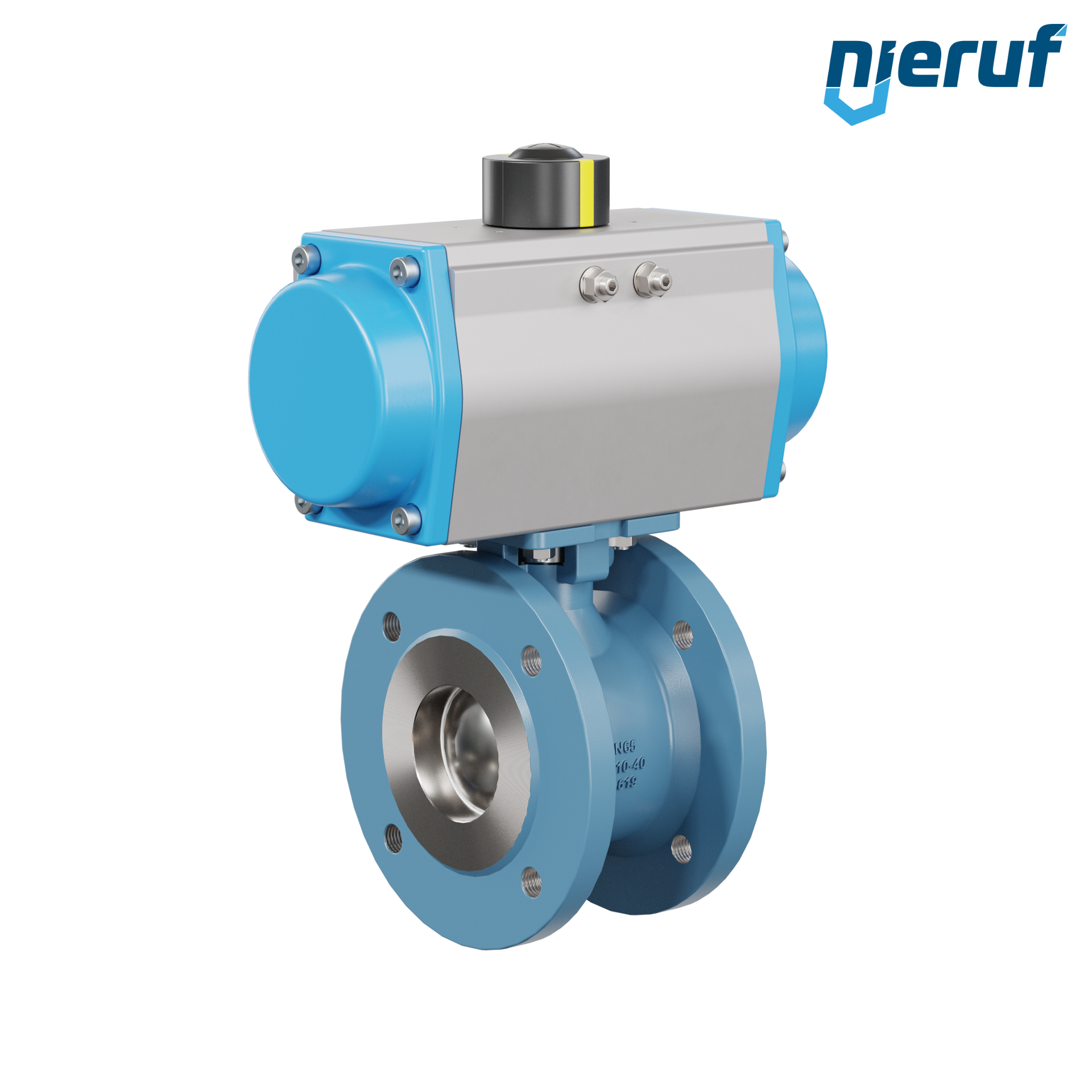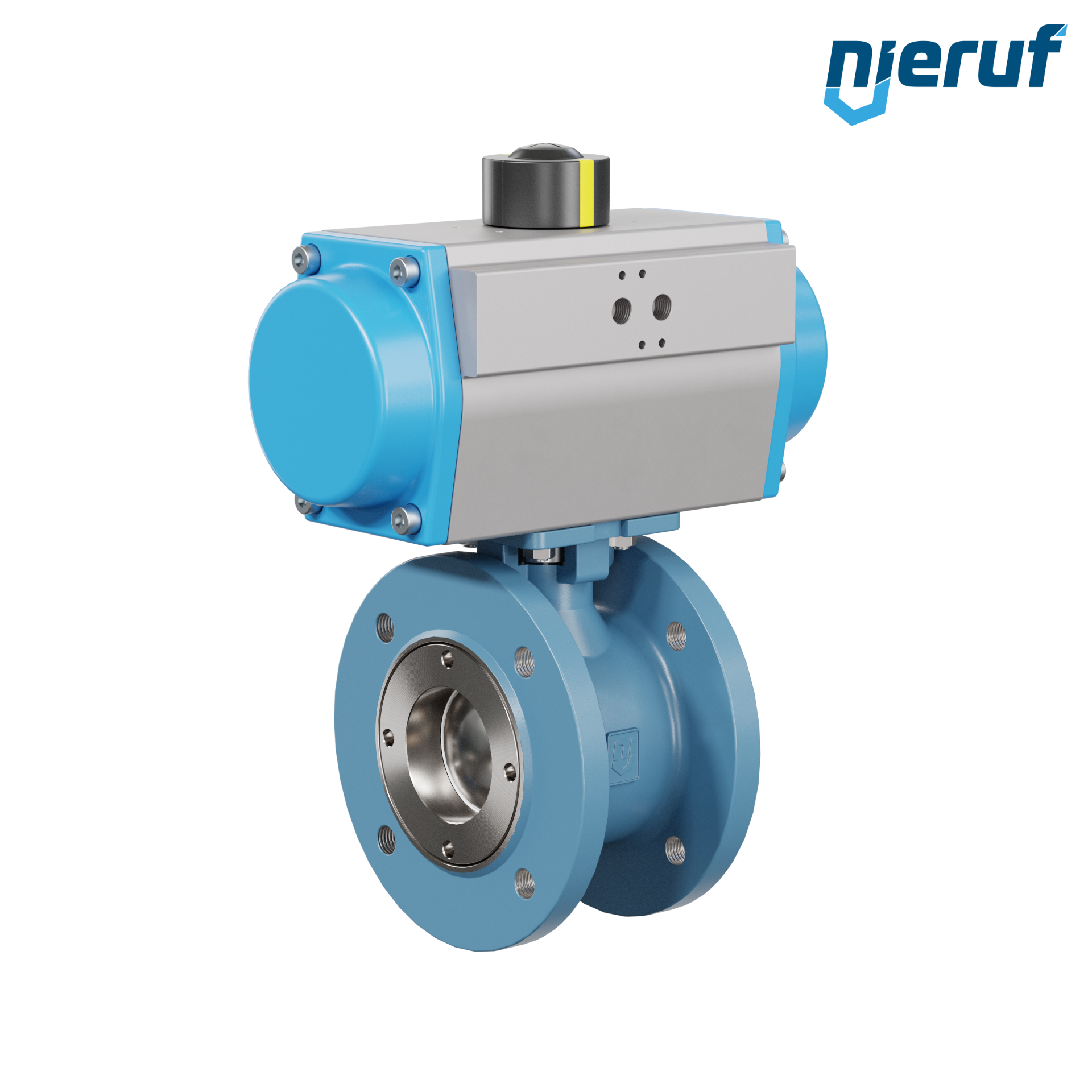 pour ce robinet à boisseau sphérique automatique à brides de haute qualité en acier moulé avec actionneur rotatif pneumatique (GS = simple effet), le montage direct sur bride des électrovannes Namur est possible.