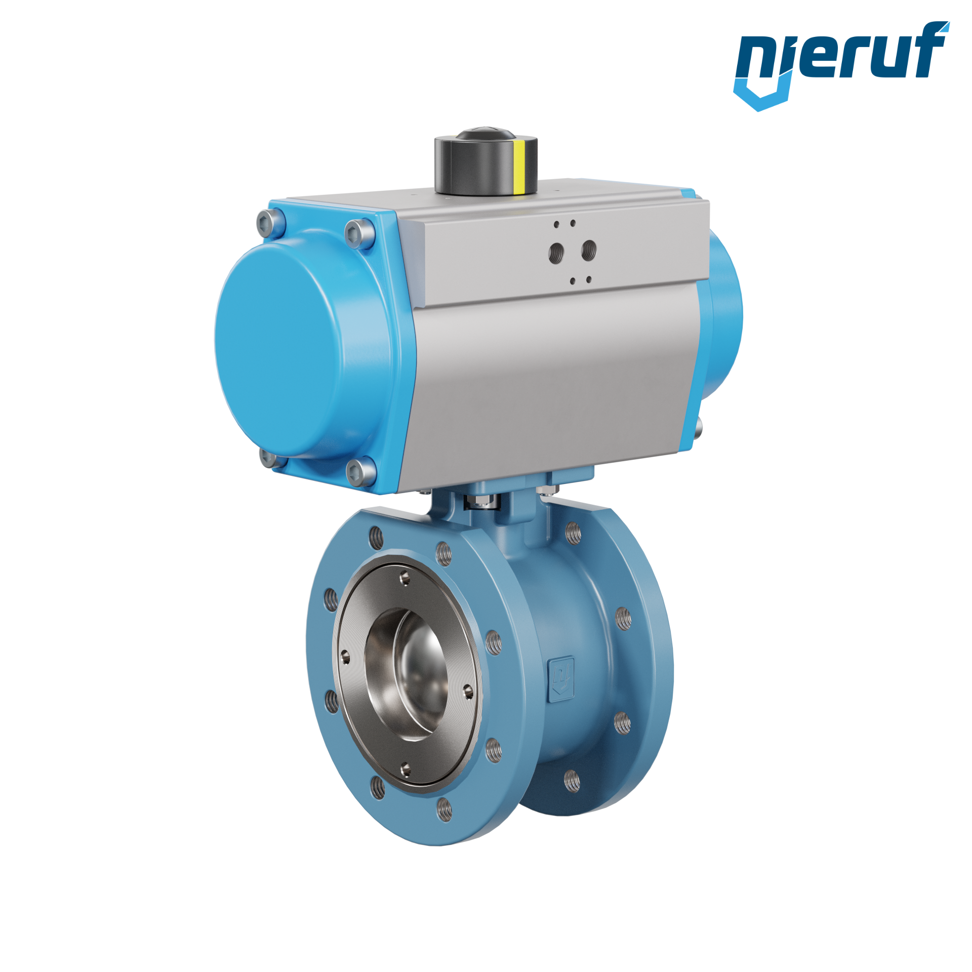 pour ce robinet à boisseau sphérique automatique à brides de haute qualité en acier moulé avec actionneur rotatif pneumatique (GS = simple effet), le montage direct sur bride des électrovannes Namur est possible.