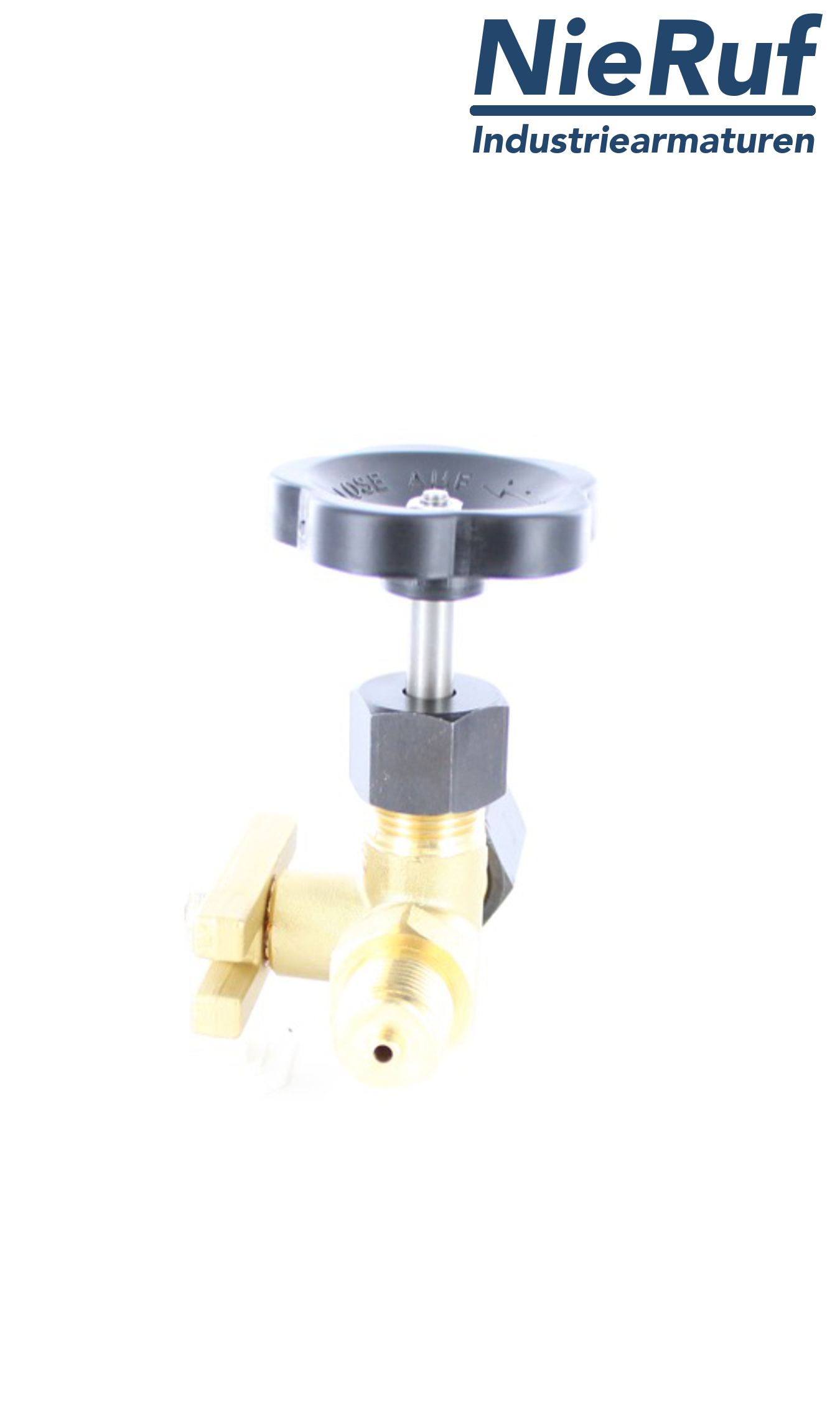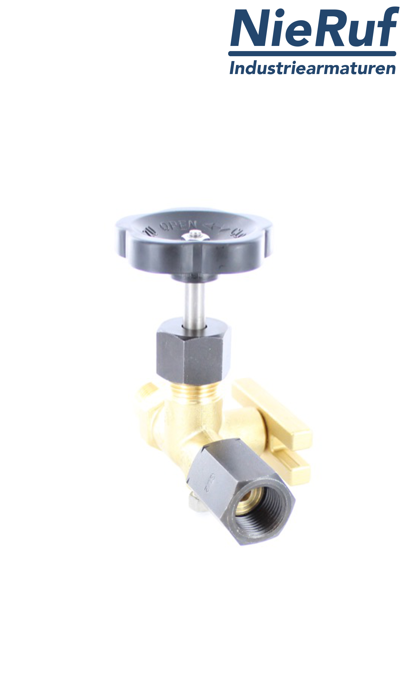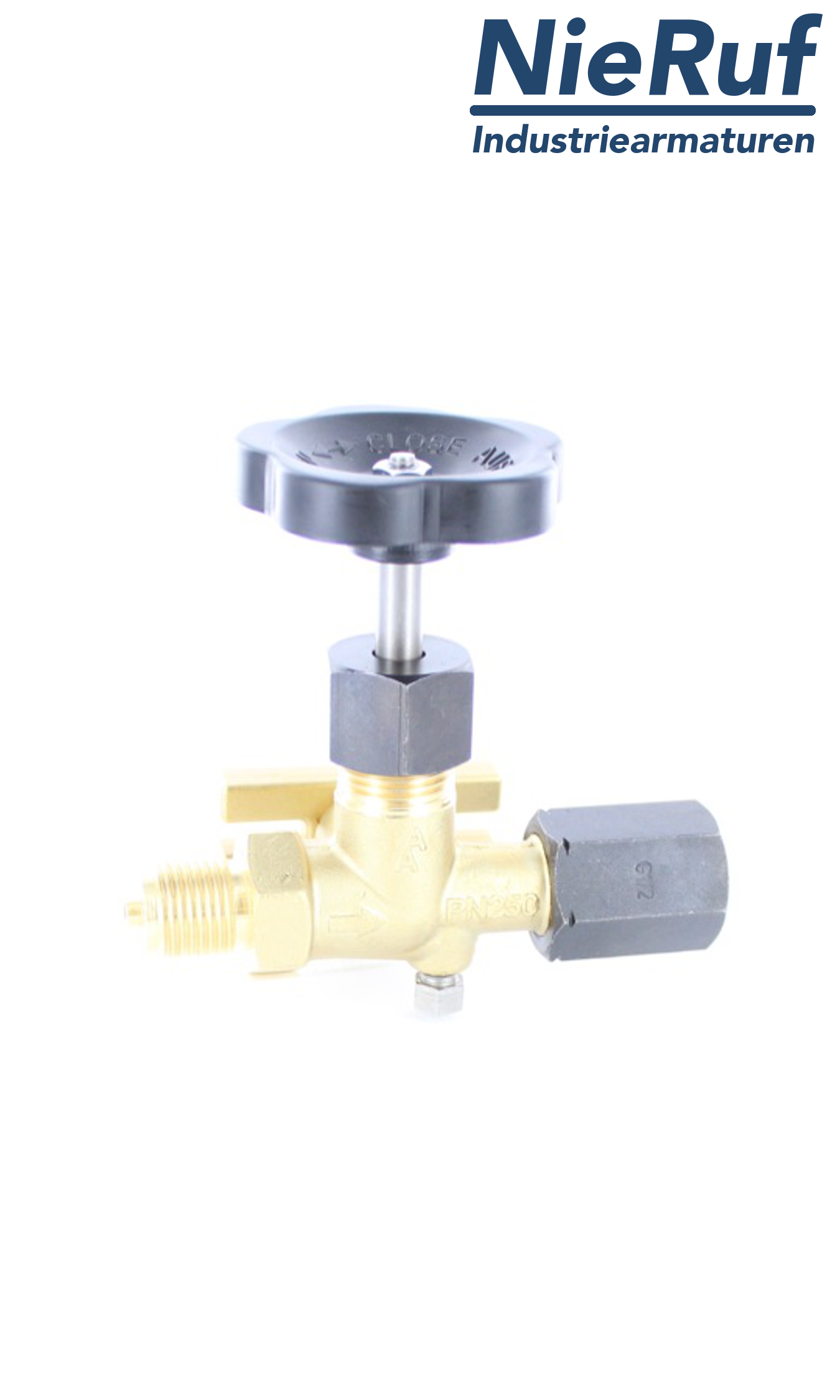 vanne d'arrêt pour manomètre DIN 16271 en laiton jusqu'à 250 bar avec 1/2" pouce raccordement manchon x filetage mâle x bride d'essai 60x25 mm
