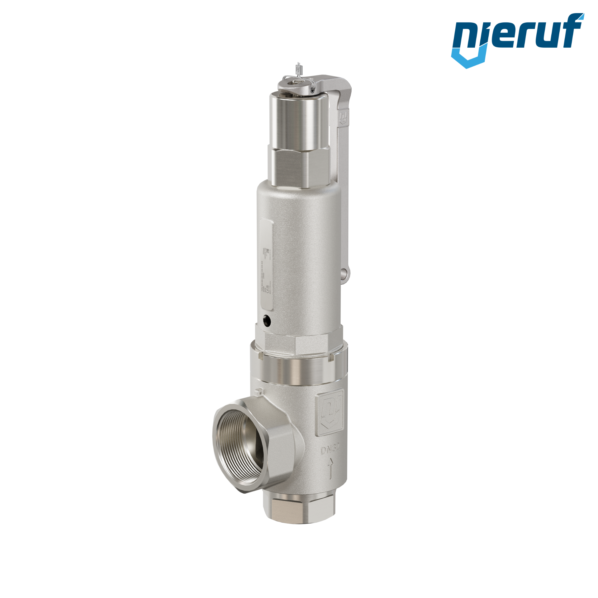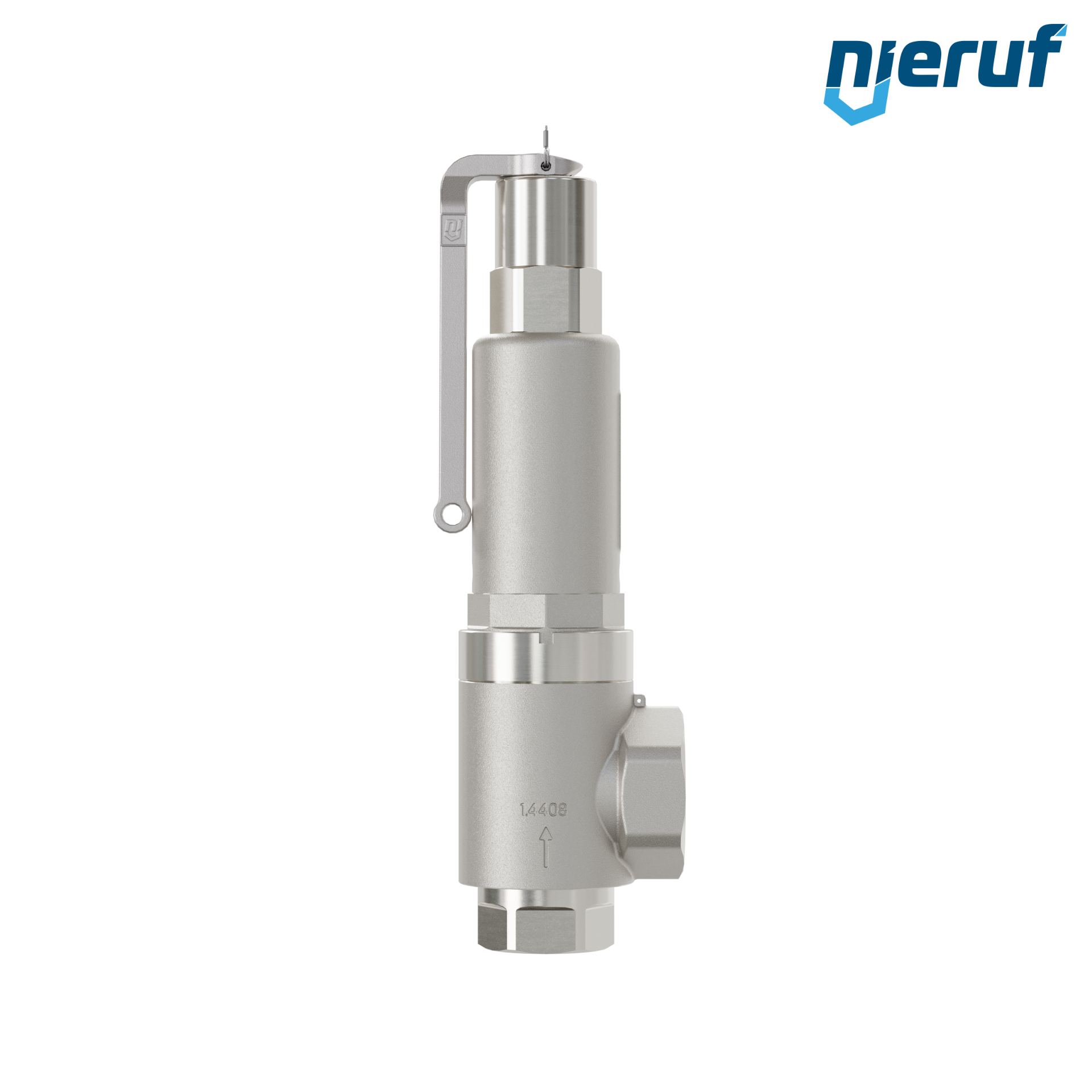 soupape de sûreté pour fluides liquides PTFE 1 1/2" x 2" femelle acier inoxydable modèle SV06 avec femelle BSP-P avec levier et avec manchon d'étanchéité