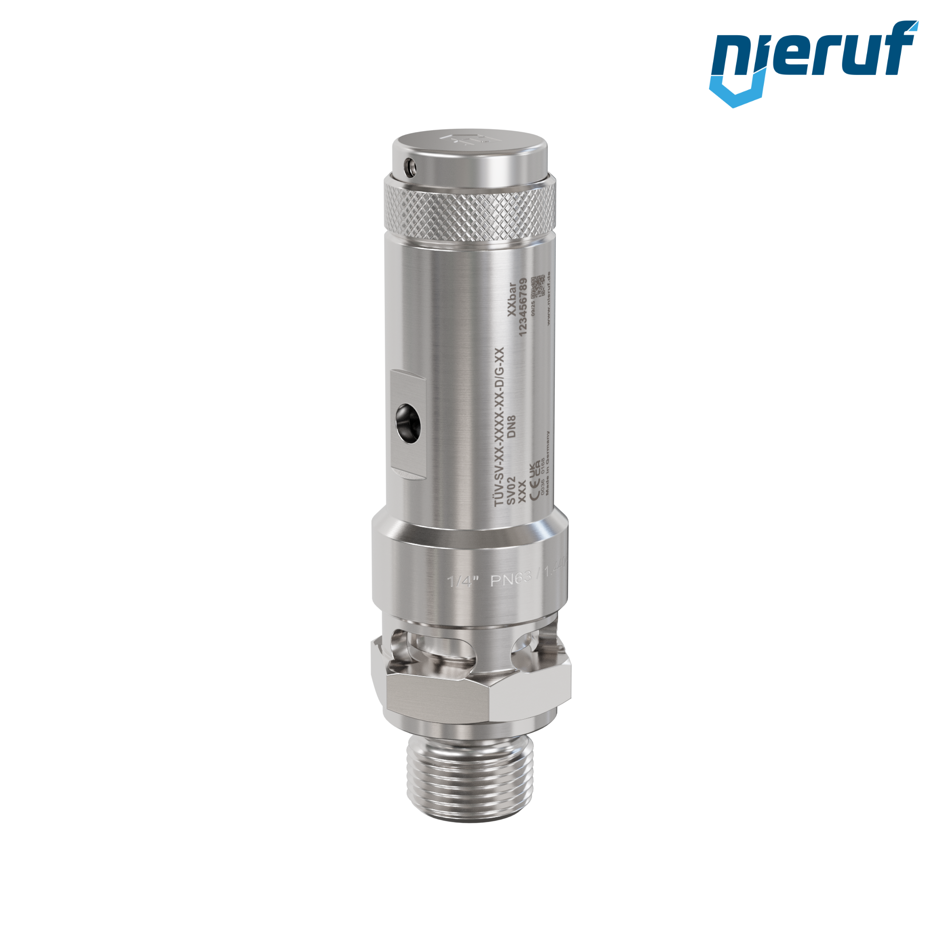 soupape de sûreté 1/4" mâle modèle SV02 avec décharge libre pour air comprimé et applications pneumatiques, en acier inoxydable avec joint en FKM , pression de réglage 0,2 - 25,0 bar - pour pressions plus élevées : version PTFE disponible