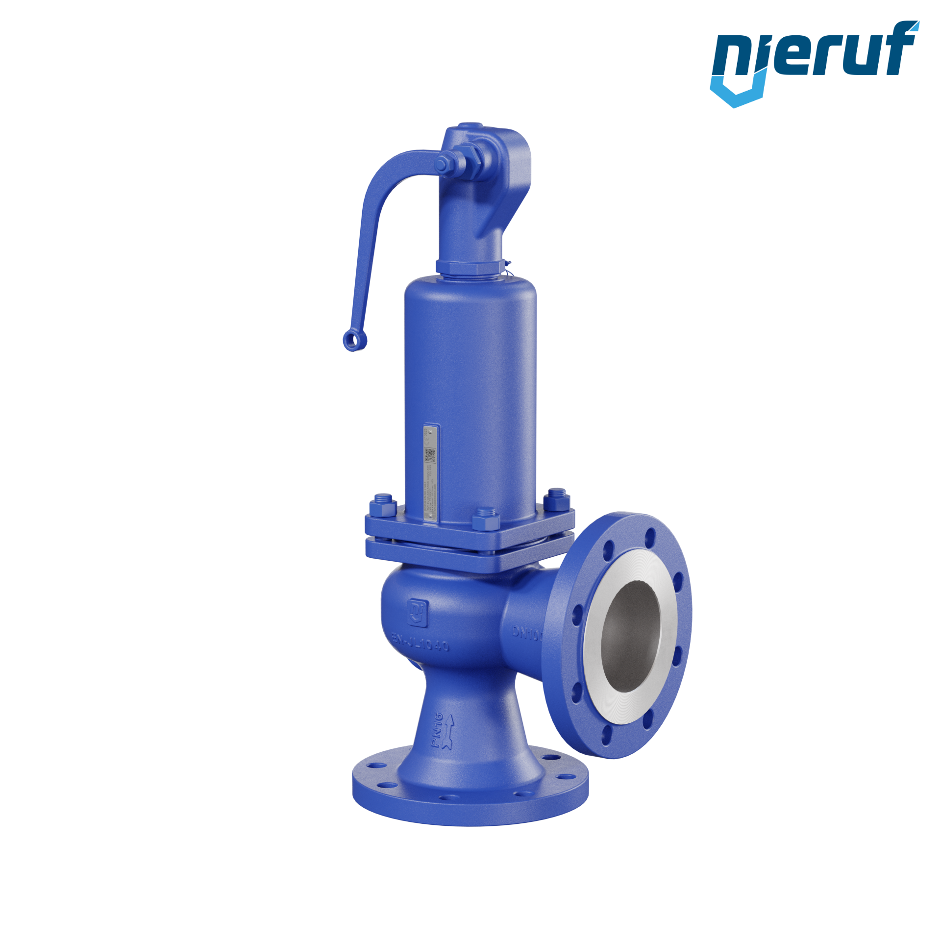 soupape de sûreté à brides DN100/DN100 avec volet d'échappement fermé et bonnet fermé en fonte grise EN-JL1040 réglage de la pression 0,2 jusqu'à un maximum de 16 bar avec levier