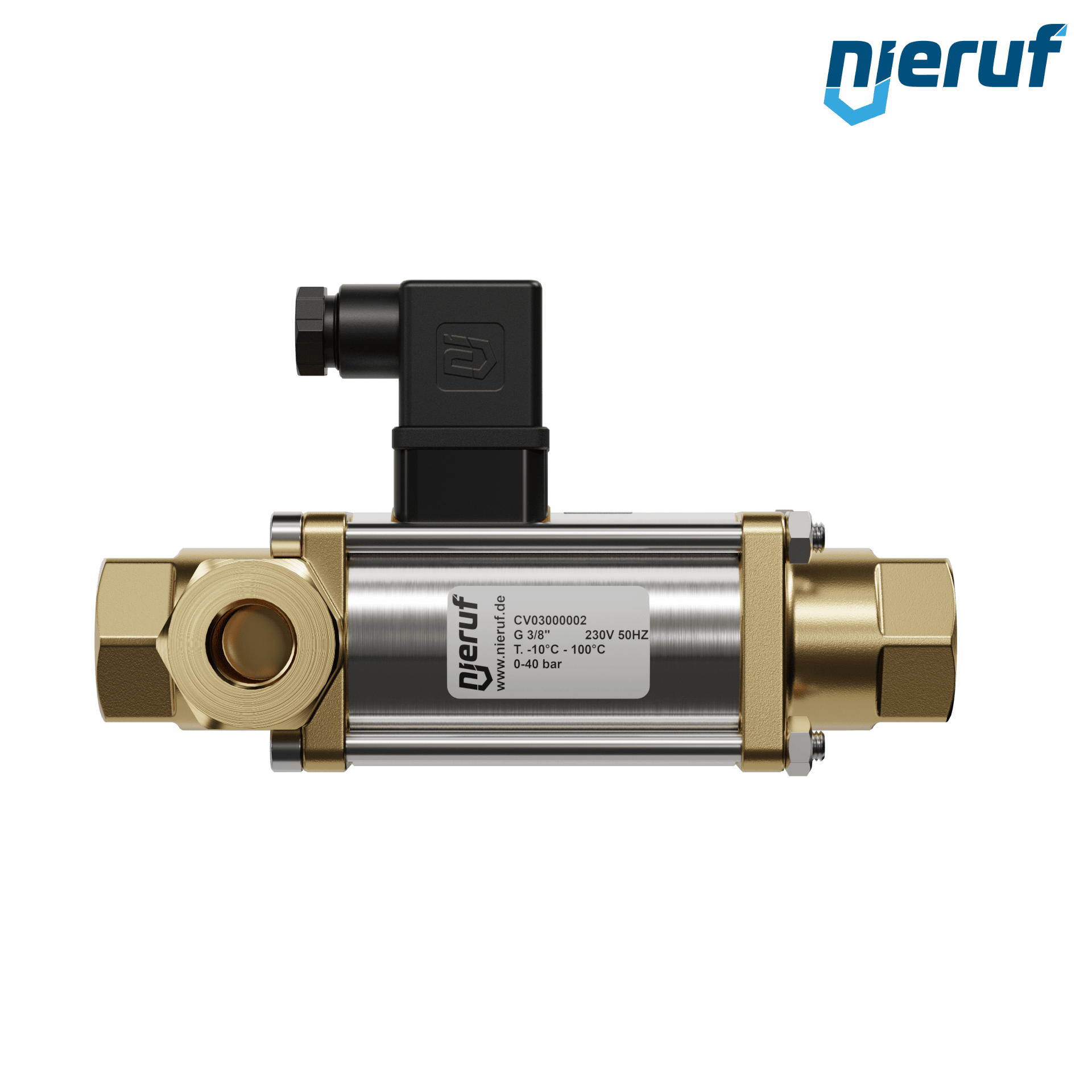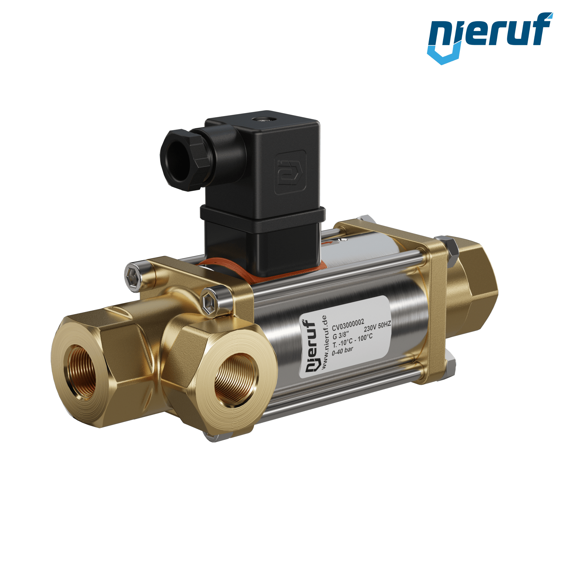 vanne coaxiale à 3/2 voies 3/8" pouce femelle - DN10 en laiton, à commande directe jusqu'à 40 bars maximum, NC - normalement fermé, voltage 230V AC