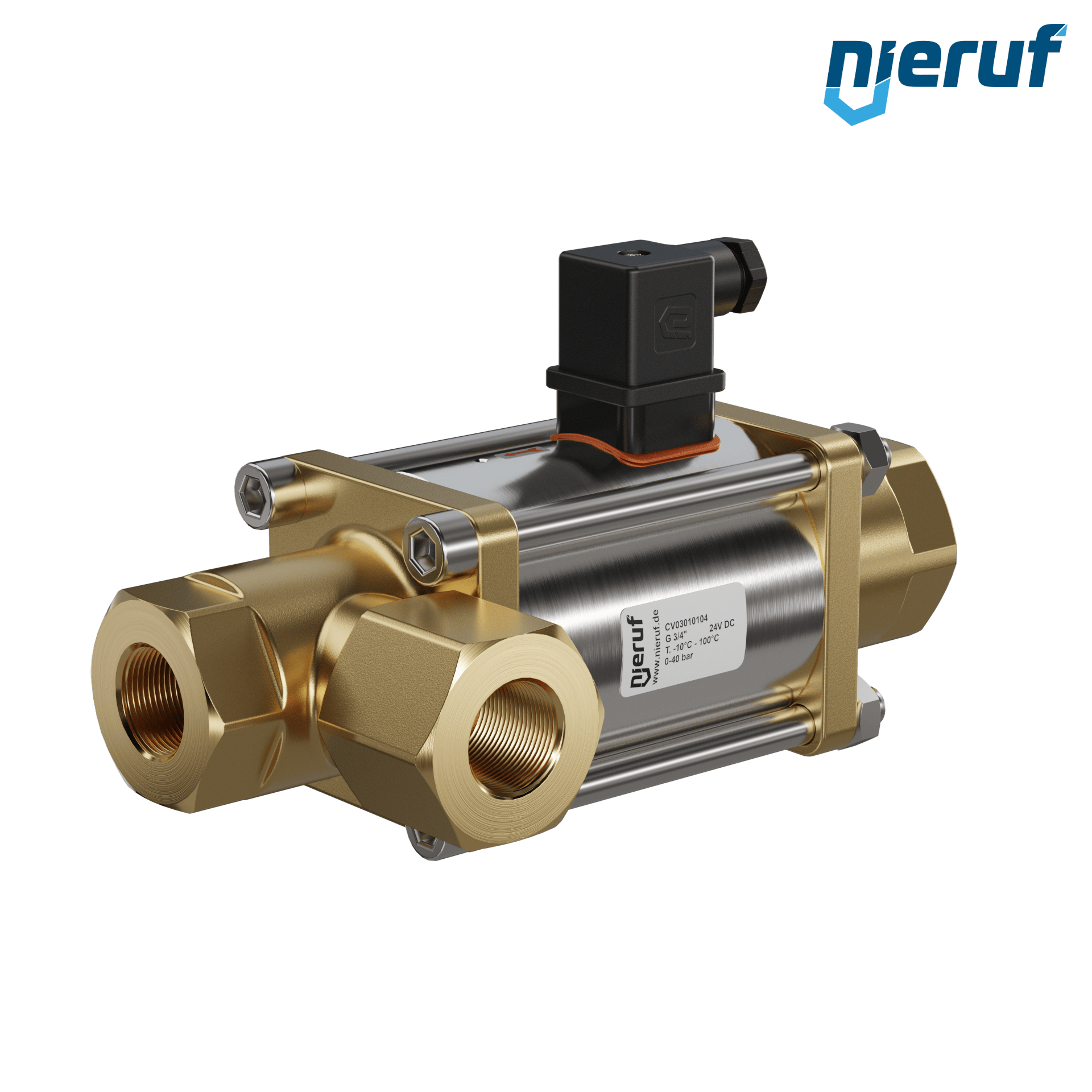 vanne coaxiale à 3/2 voies 3/4" pouce femelle - DN20 en laiton, à commande directe jusqu'à 40 bars maximum, NO - normalement ouvert, voltage 24V DC