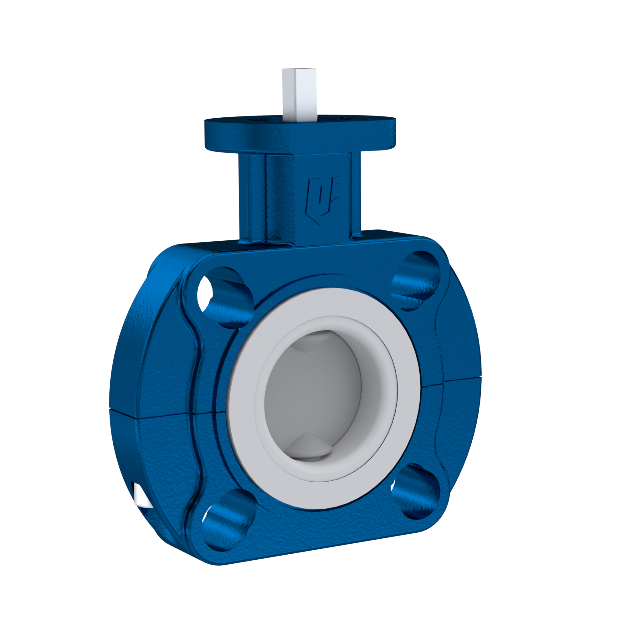 Vanne papillon avec manchette en PTFE et papillon en acier inoxydable pour les fluides agressifs.