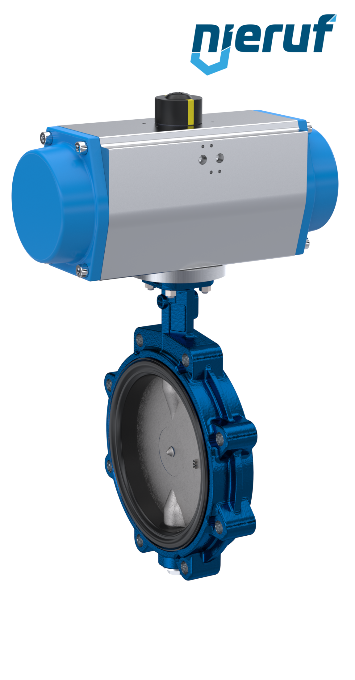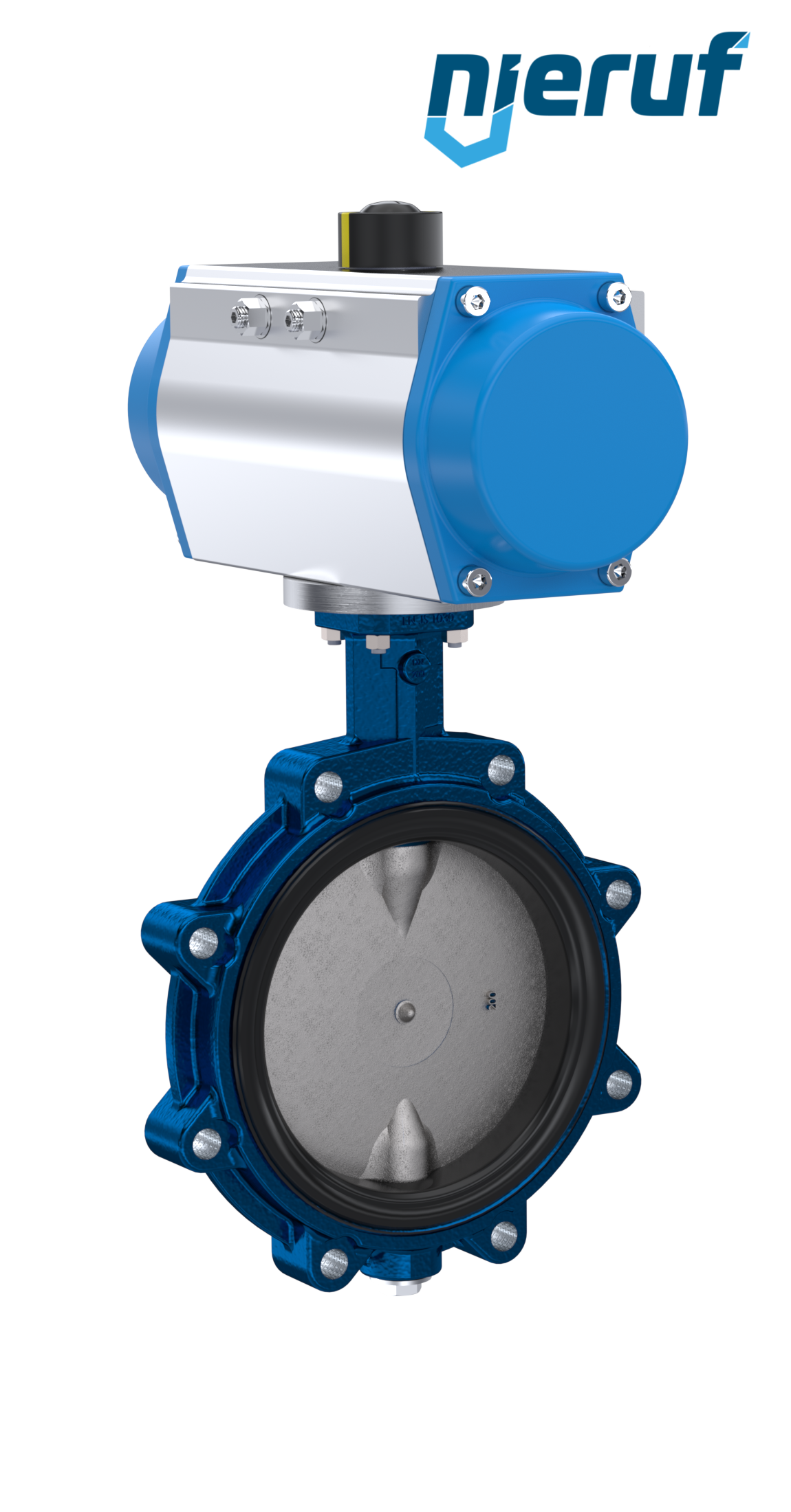 vanne papillon DN 100 avec oreilles taraudées / lug corps en fonte à graphite sphéroïdal avec actionneur pneumatique à simple effet fermeture par ressort manchette en EPDM haute température & FDA