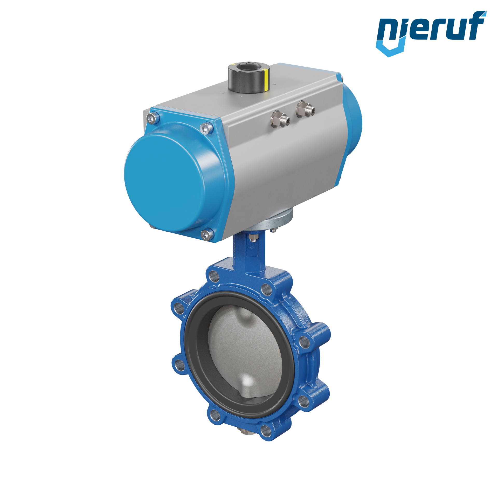 vanne papillon DN 150 avec oreilles taraudées / lug corps en fonte à graphite sphéroïdal avec actionneur pneumatique à simple effet fermeture par ressort manchette en NBR-70-noir DVGW gaz