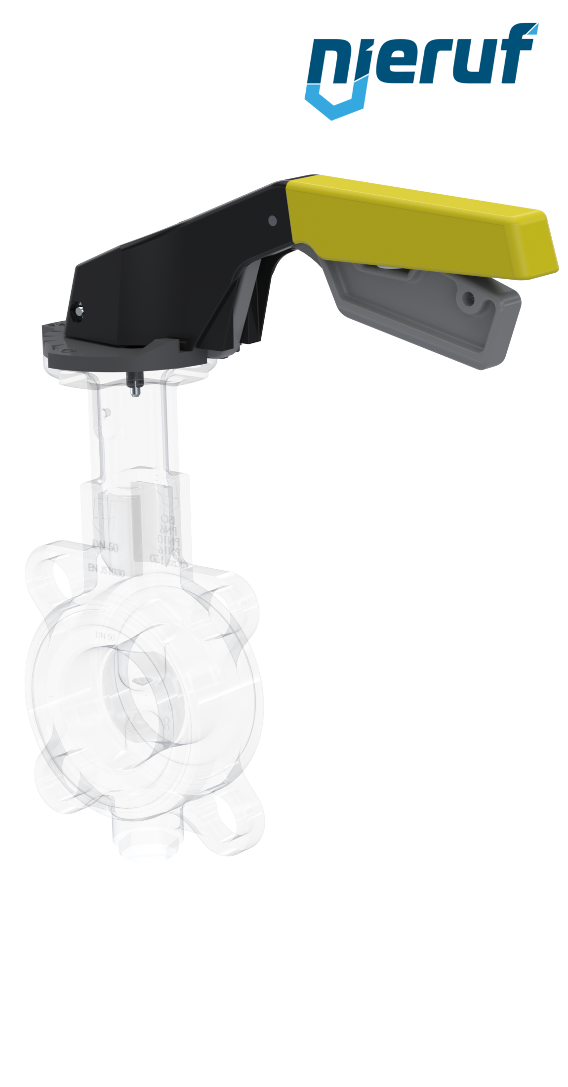 vanne papillon DN 50 PN6-PN10-PN16 & ANSI150 avec oreilles centrées / wafer fonte à graphite sphéroïdal avec levier manuel jaune NBR-70-noir DVGW gaz