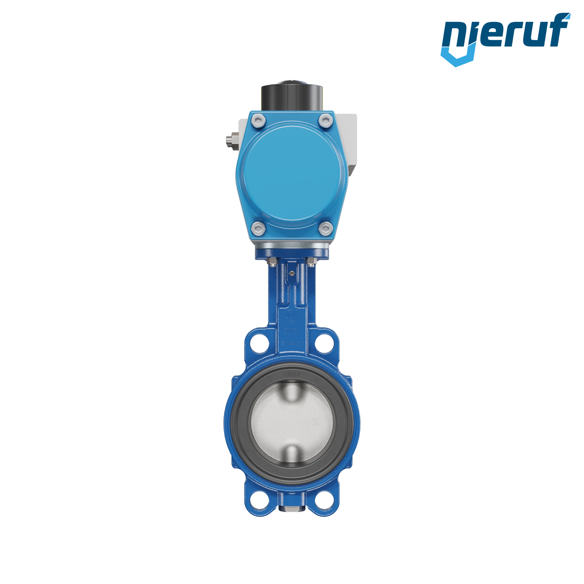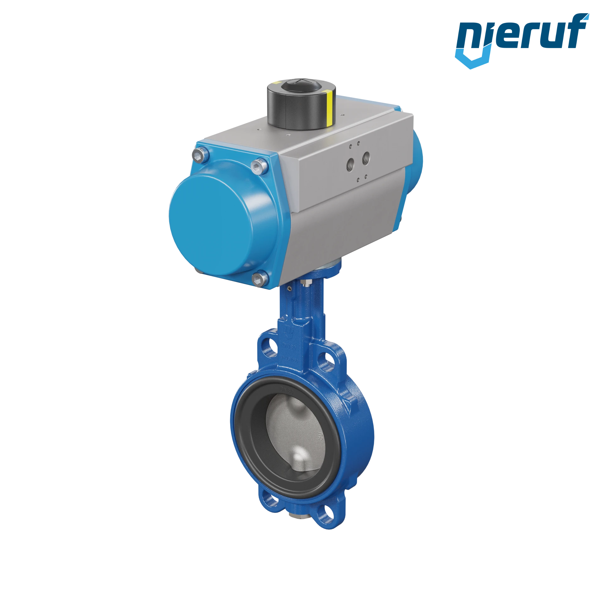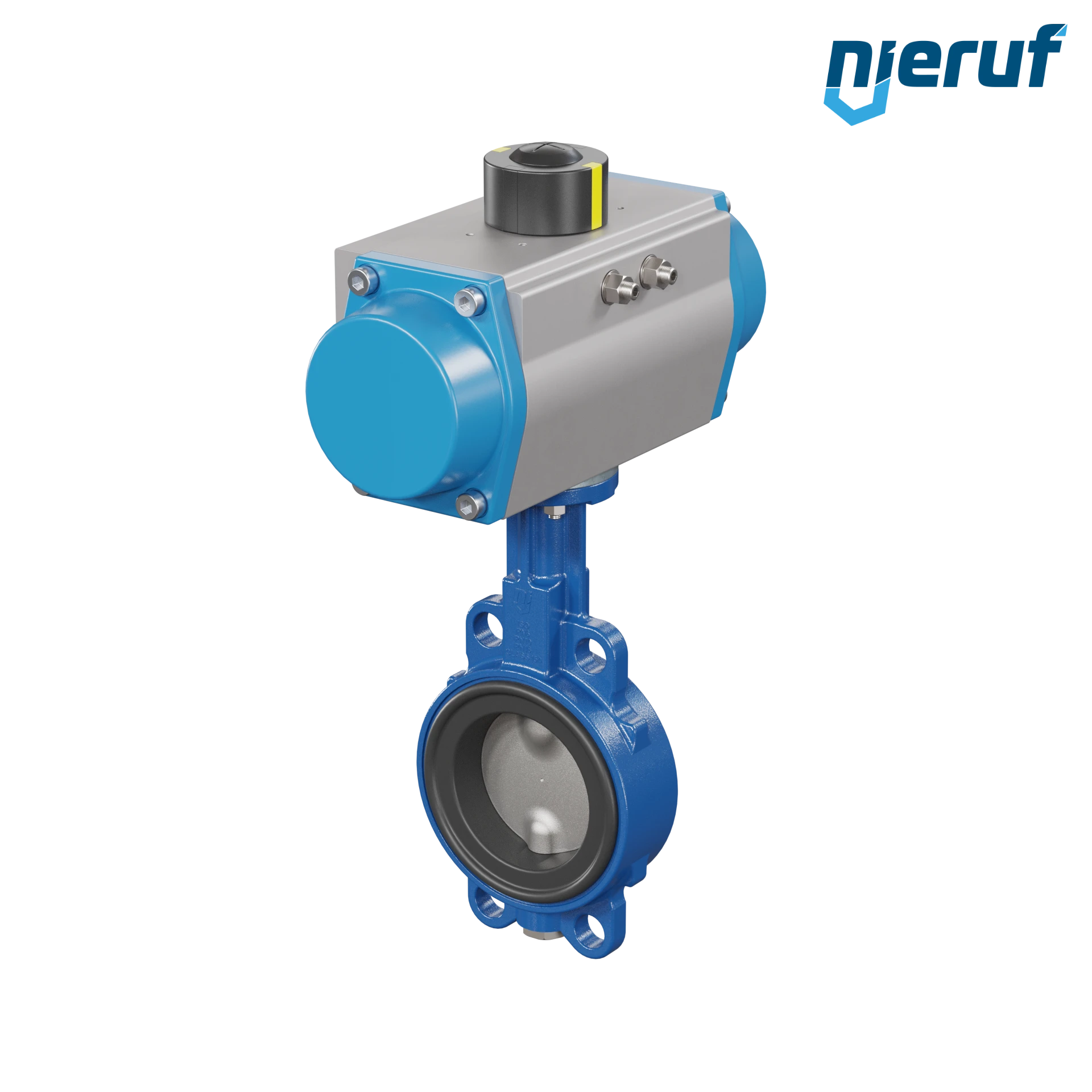 vanne papillon DN 80 avec oreilles centrées / wafer corps en fonte à graphite sphéroïdal avec actionneur pneumatique à simple effet fermeture par ressort manchette en NBR-70-noir DVGW gaz