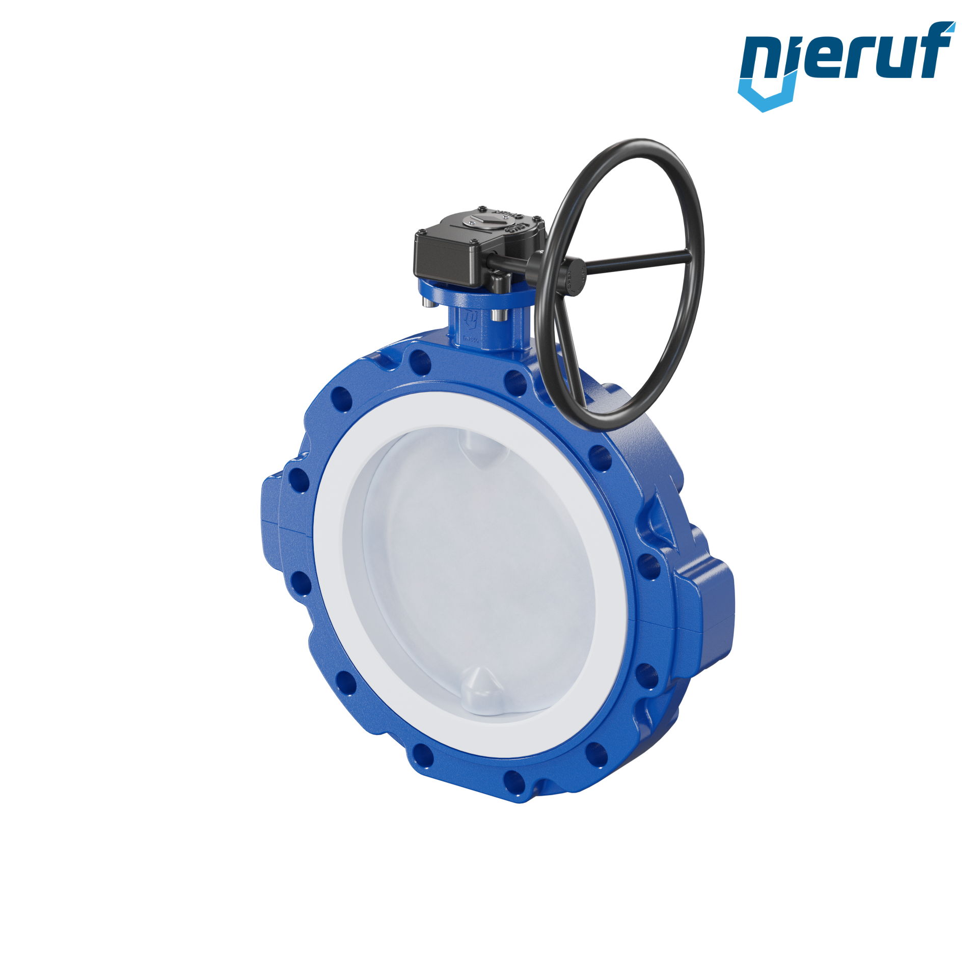 vanne papillon PFA DN350 ANSI150 avec oreilles centrées / wafer papillon PFA avec réducteur à volant joint en PTFE et insertion EPDM pour fluides aggressifs