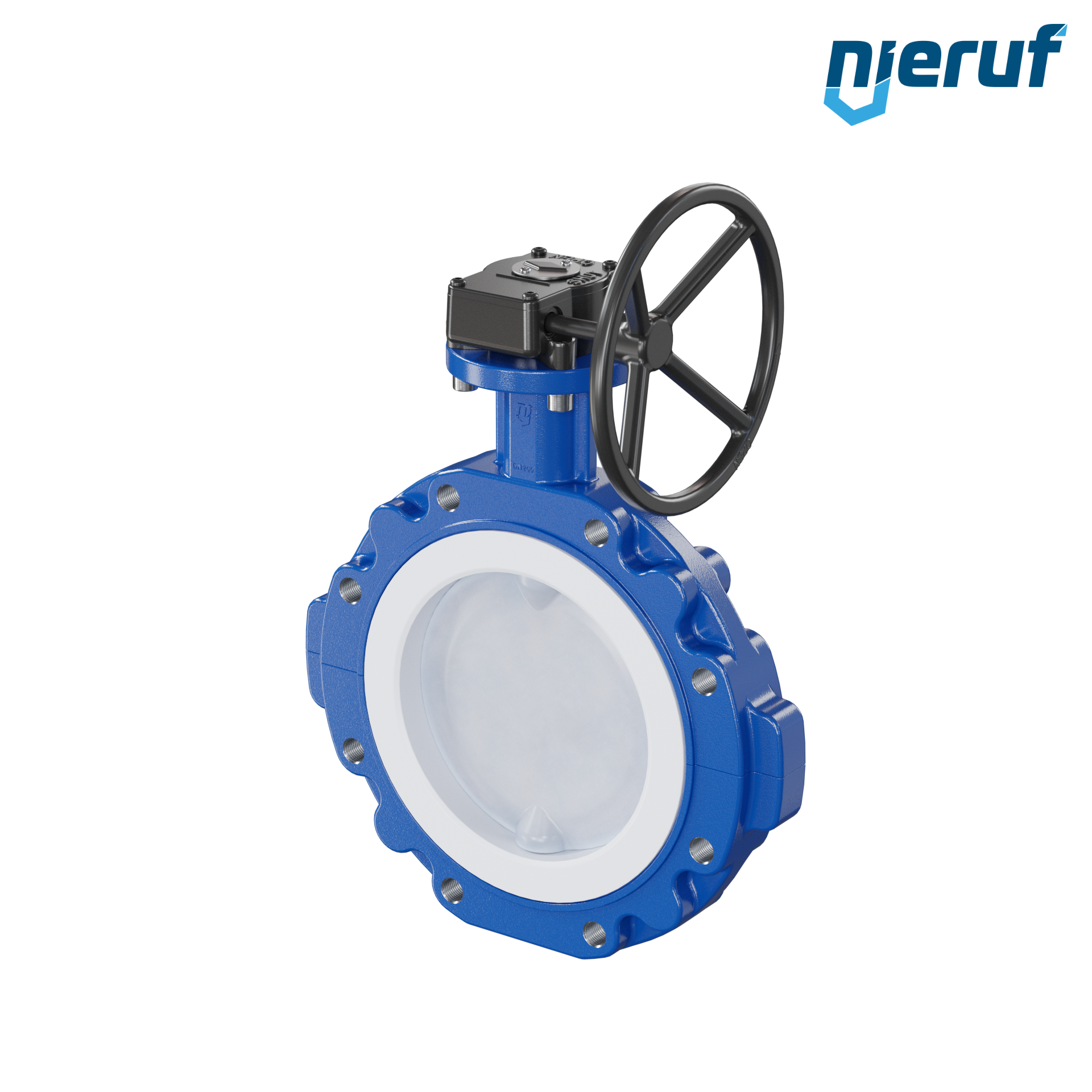 vanne papillon PFA DN200 ANSI150 avec oreilles taraudées / lug papillon PFA avec réducteur à volant joint en PTFE et insertion FKM pour fluides aggressifs