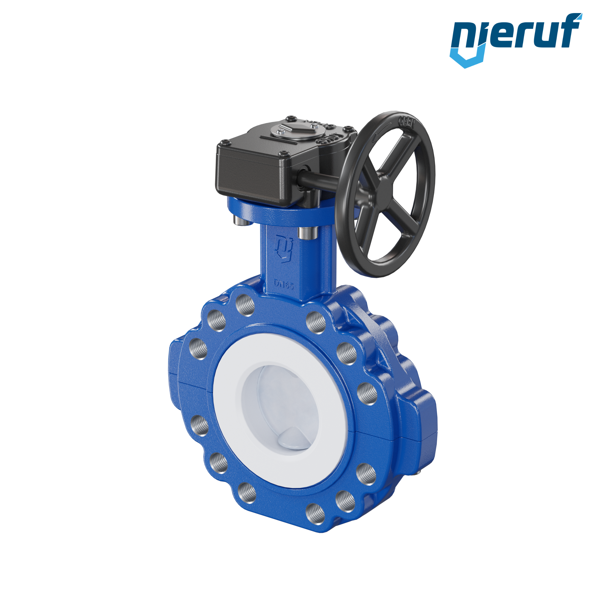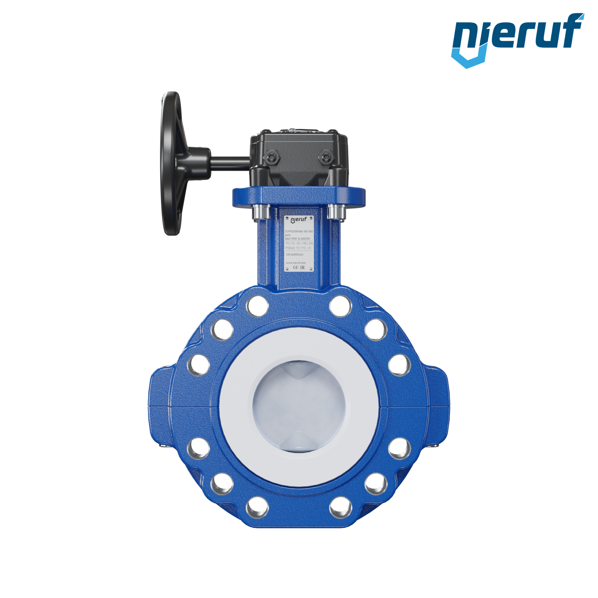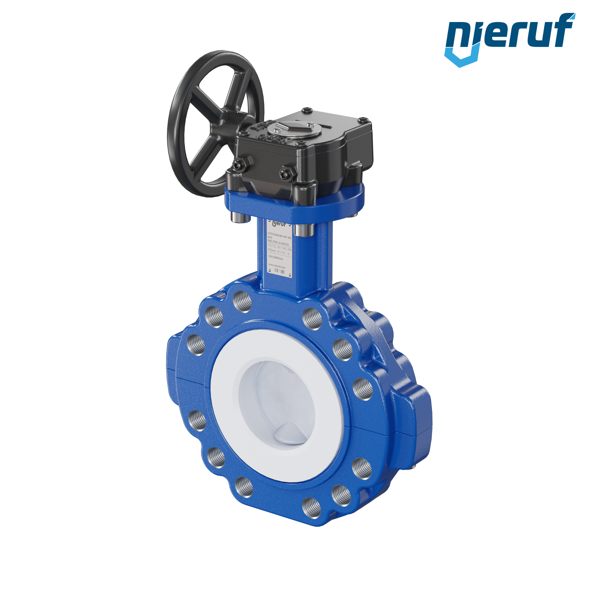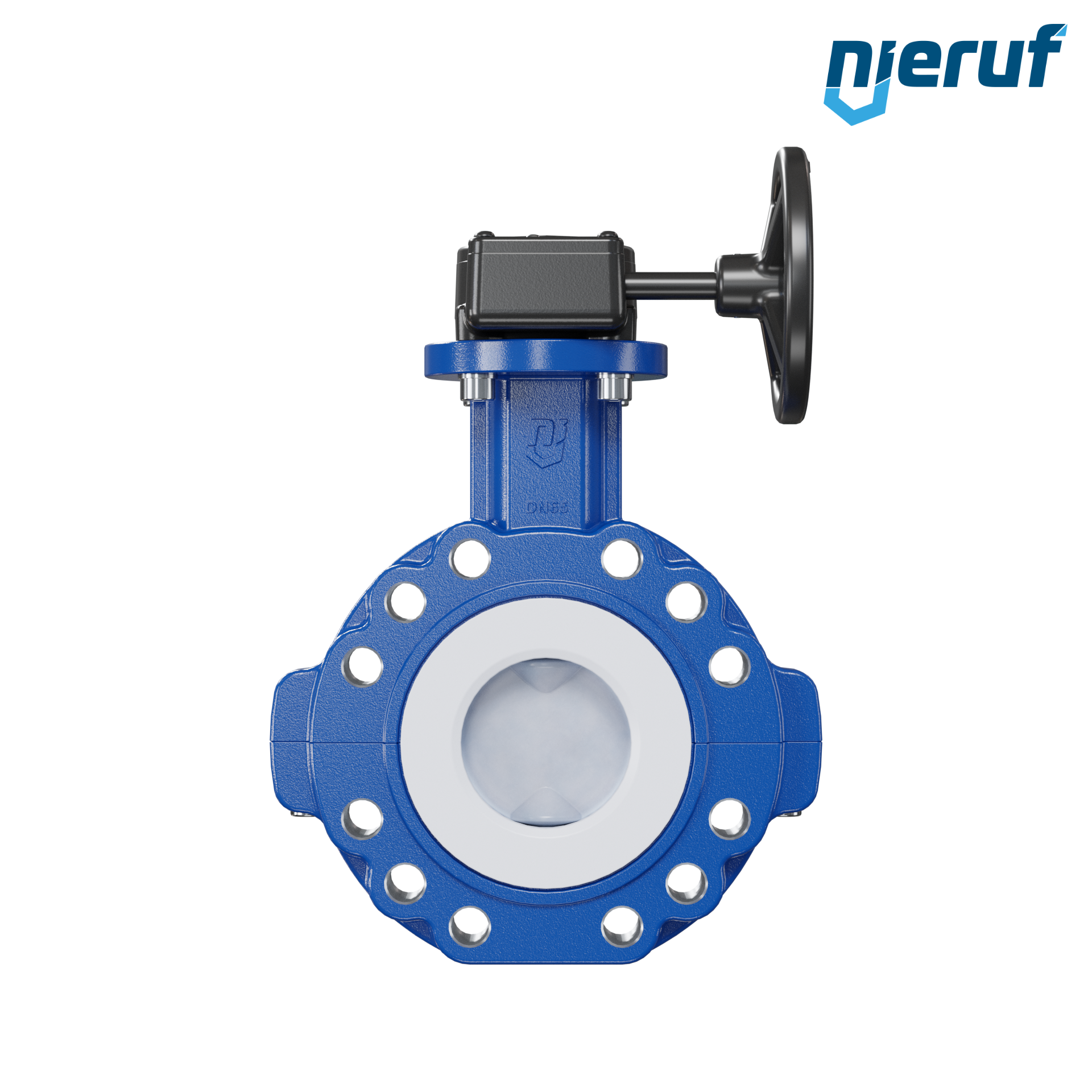 vanne papillon PFA DN65 PN10-PN16 avec oreilles taraudées / lug papillon PFA avec réducteur à volant joint en PTFE et insertion EPDM pour fluides aggressifs